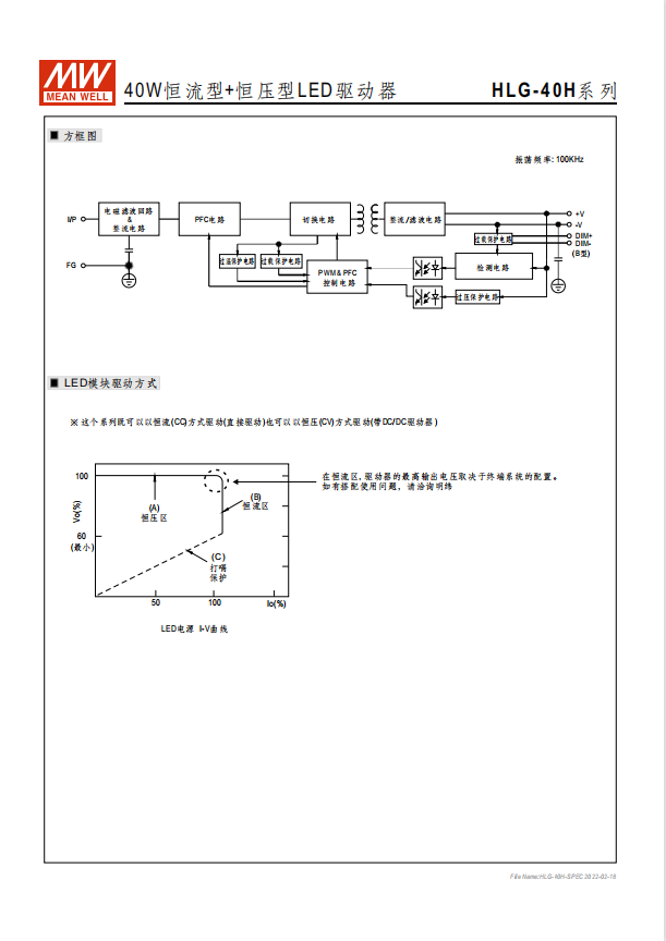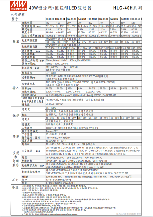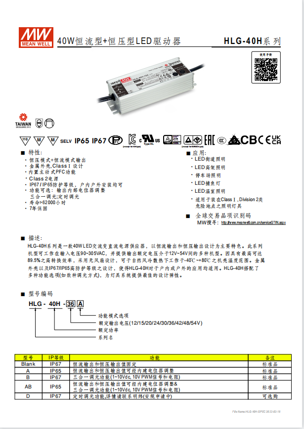 瓦數(shù): 40W~600W 功能特性 90~305VAC交流輸入,內(nèi)建主動式功率因子矯正功能(active PFC) 96%超高效率(HLG-600H) 金