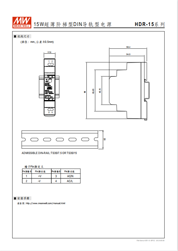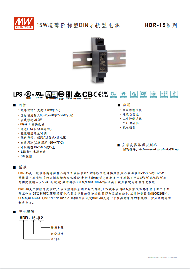 階梯形塑料機(jī)殼 單相,全范圍輸入 小尺寸, 1SU~6SU寬 (DIN EN43880) 雙重絕緣等級(jí) 直流輸出電壓可調(diào) 空載待機(jī)消耗瓦數(shù)<0.3W 適合安裝于DIN rail TS-35 / 7.5 或 15 適用于建筑及家電自動(dòng)化控制