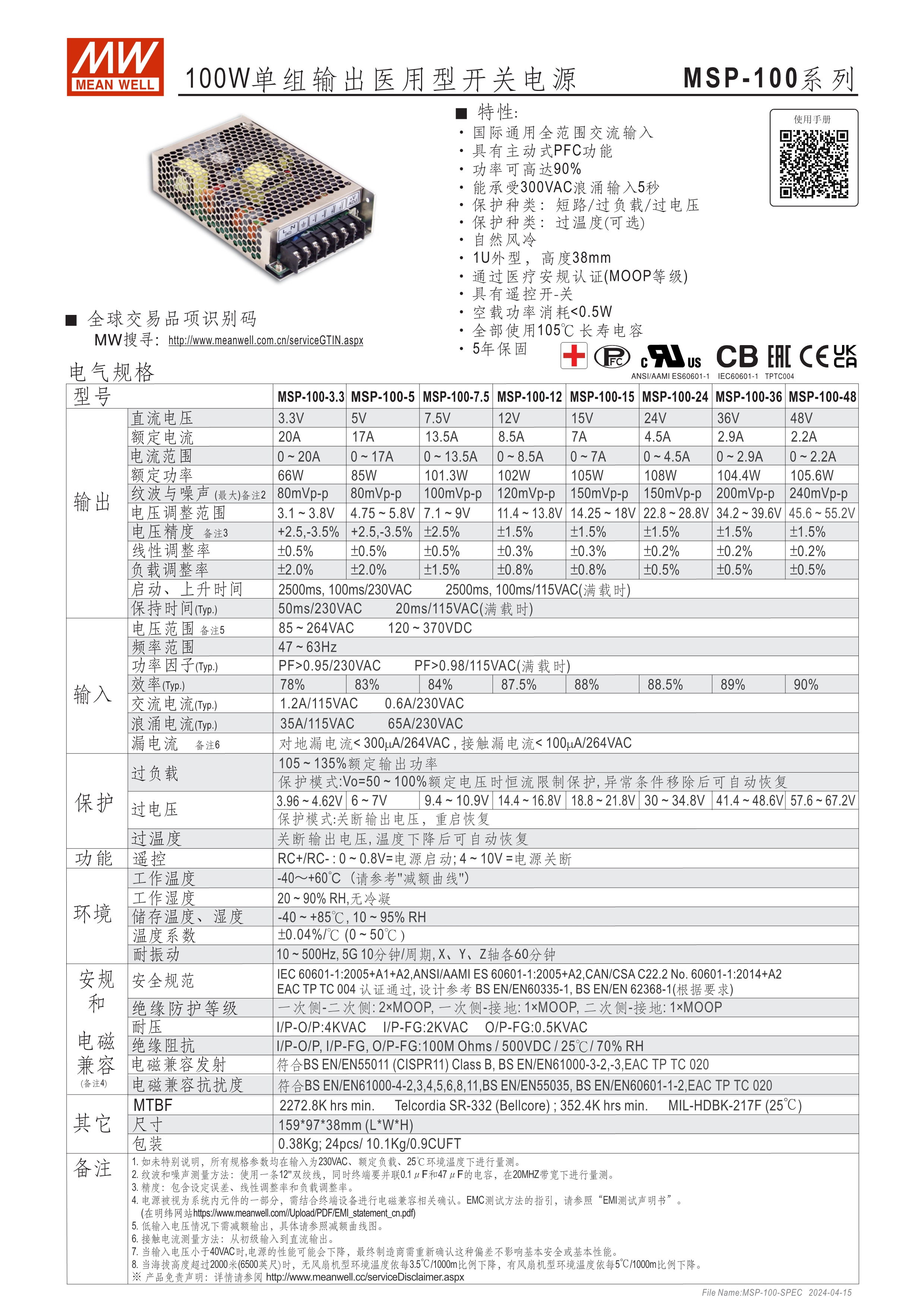 醫(yī)療用等級,內(nèi)建主動式功率因子矯正功能(active PFC) 通過醫(yī)療類安規(guī)認證(MOOP等級) 高效能,空載待機消耗瓦數(shù)<0.5W~0.8W 5年保固期