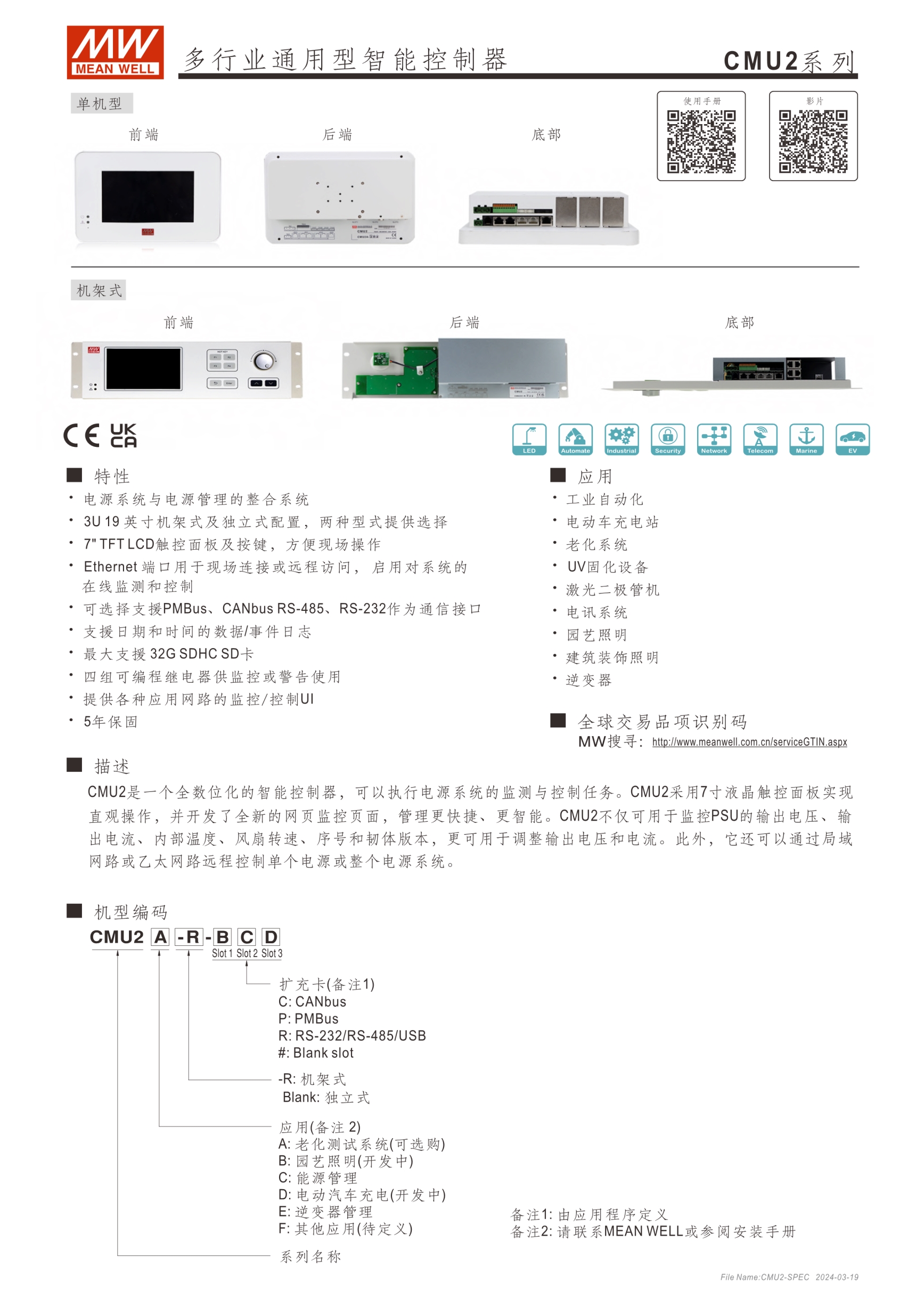 電源系統(tǒng)與電源管理的整合系統(tǒng) 3U 19英吋機(jī)架式及獨(dú)立式配置,兩種型式可選擇 7" TFT LCD觸控面板及按鍵,方便現(xiàn)場(chǎng)操作 Ethernet端口用于現(xiàn)場(chǎng)連接,或遠(yuǎn)程訪問,啟用對(duì)系統(tǒng)的在線監(jiān)測(cè)和控制 可選擇支援PMBus CANbus, RS-485, RS-232作為通信接口 提供各種應(yīng)用網(wǎng)路的監(jiān)控、控制UI