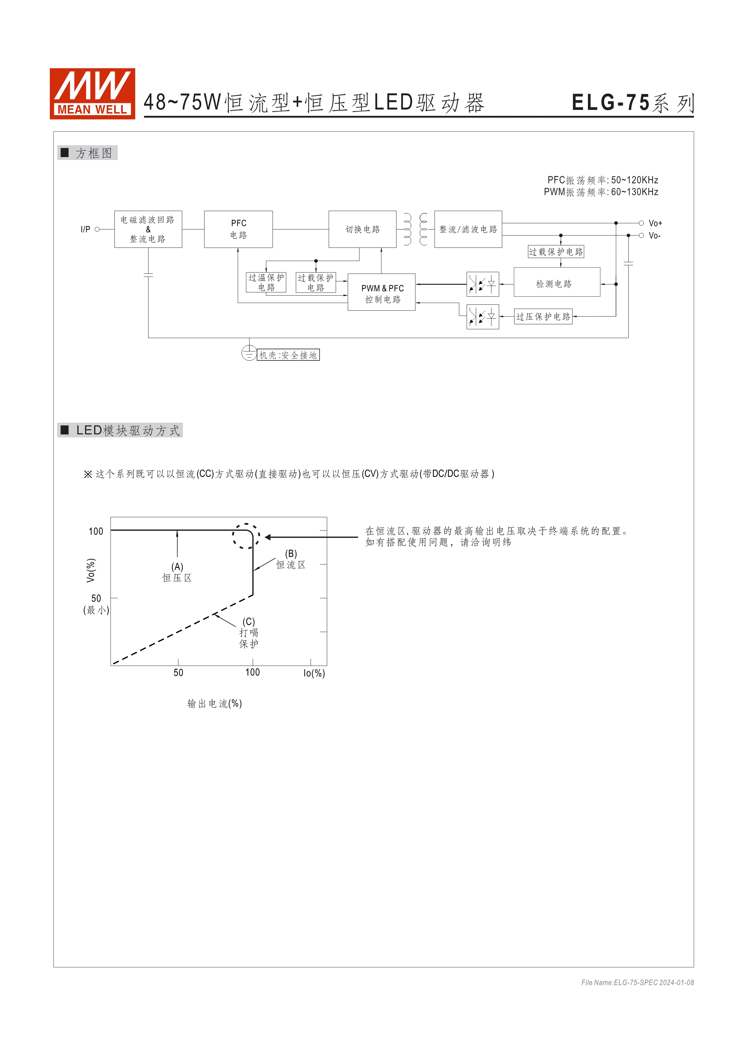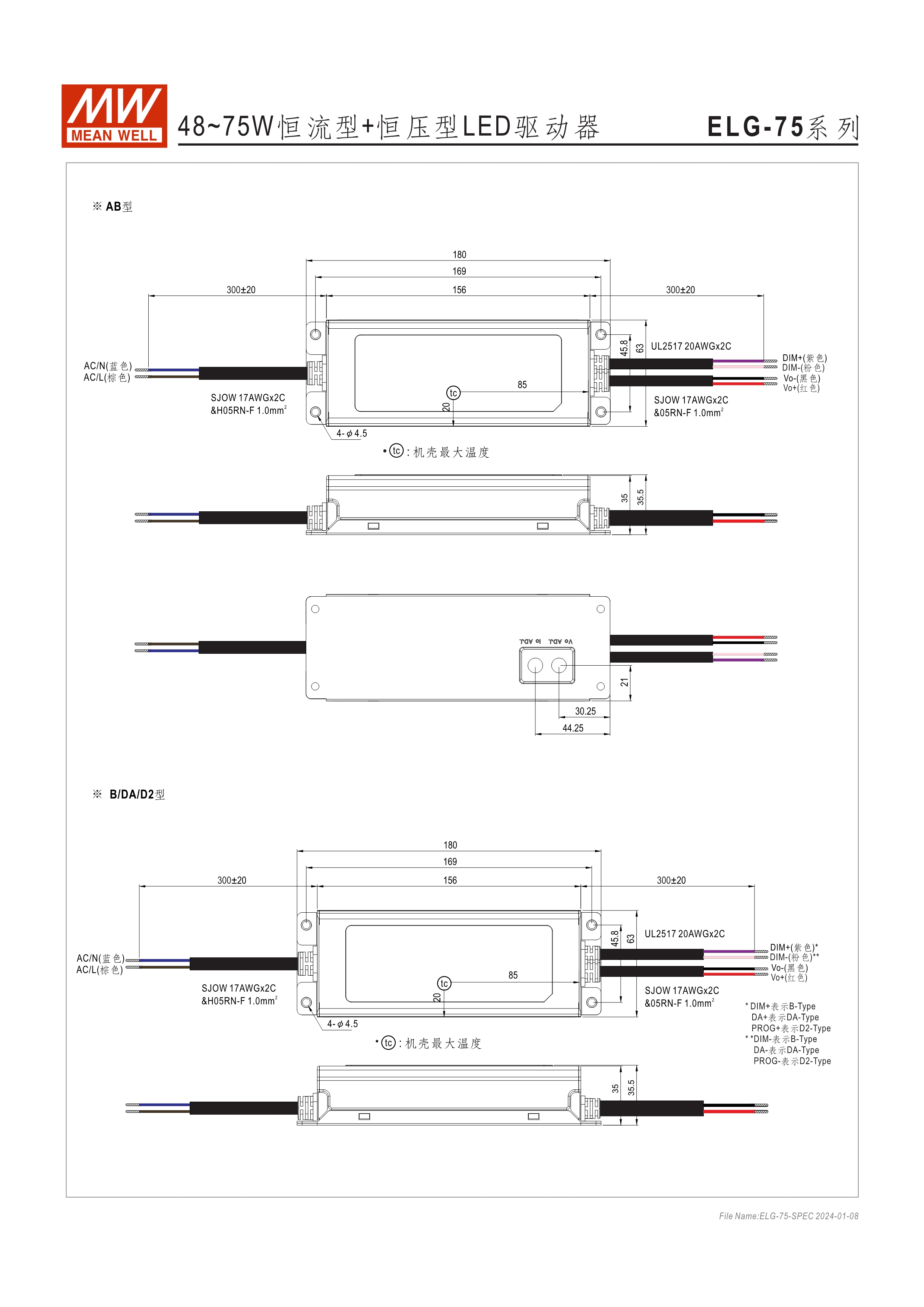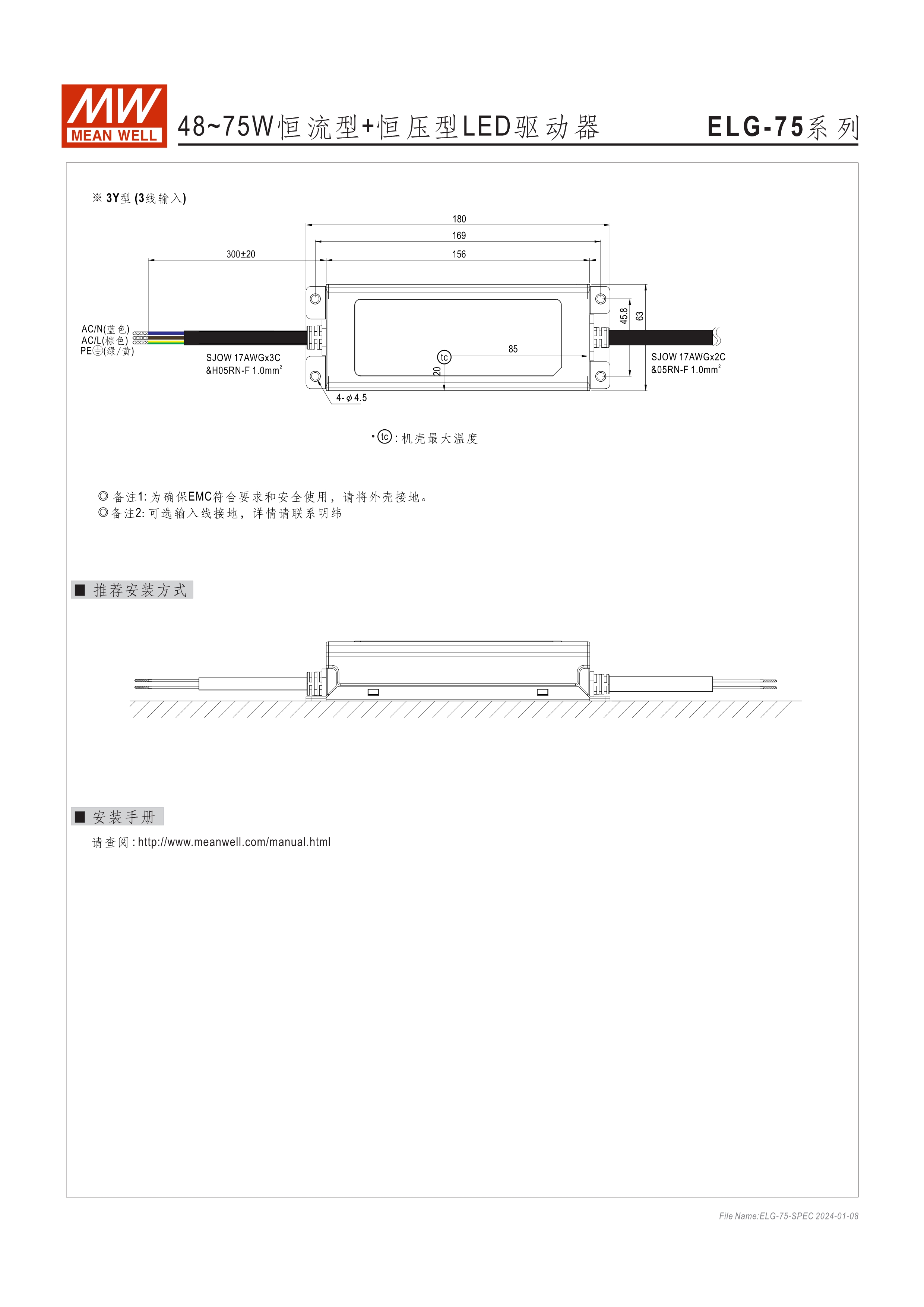 輸入范圍100~305VAC 金屬外殼,IP67/IP65防護等級可用于戶外與室內 功能選項 : 輸出可經由電位器調整;三合一調光(0~10Vdc或10V PWM信號或電阻,可關斷);智能定時調光;DALI;輔助直流輸出(ELG-150 BE-Type) Type "HL" LED電源適用在安裝于Class I, Division 2 類 危險地點之照明燈具 適合于LED路燈及戶外LED照明等應用 5年保固期
