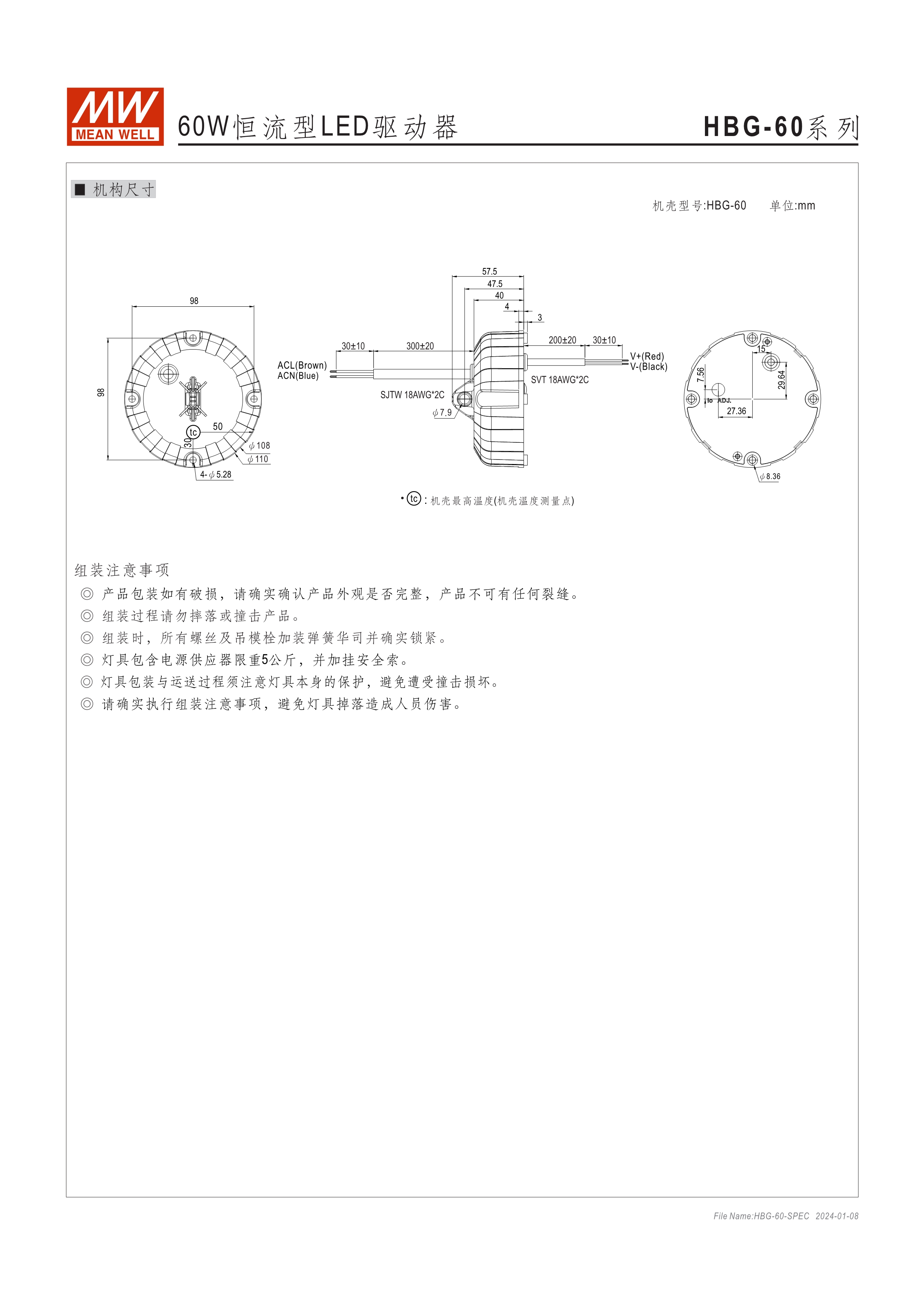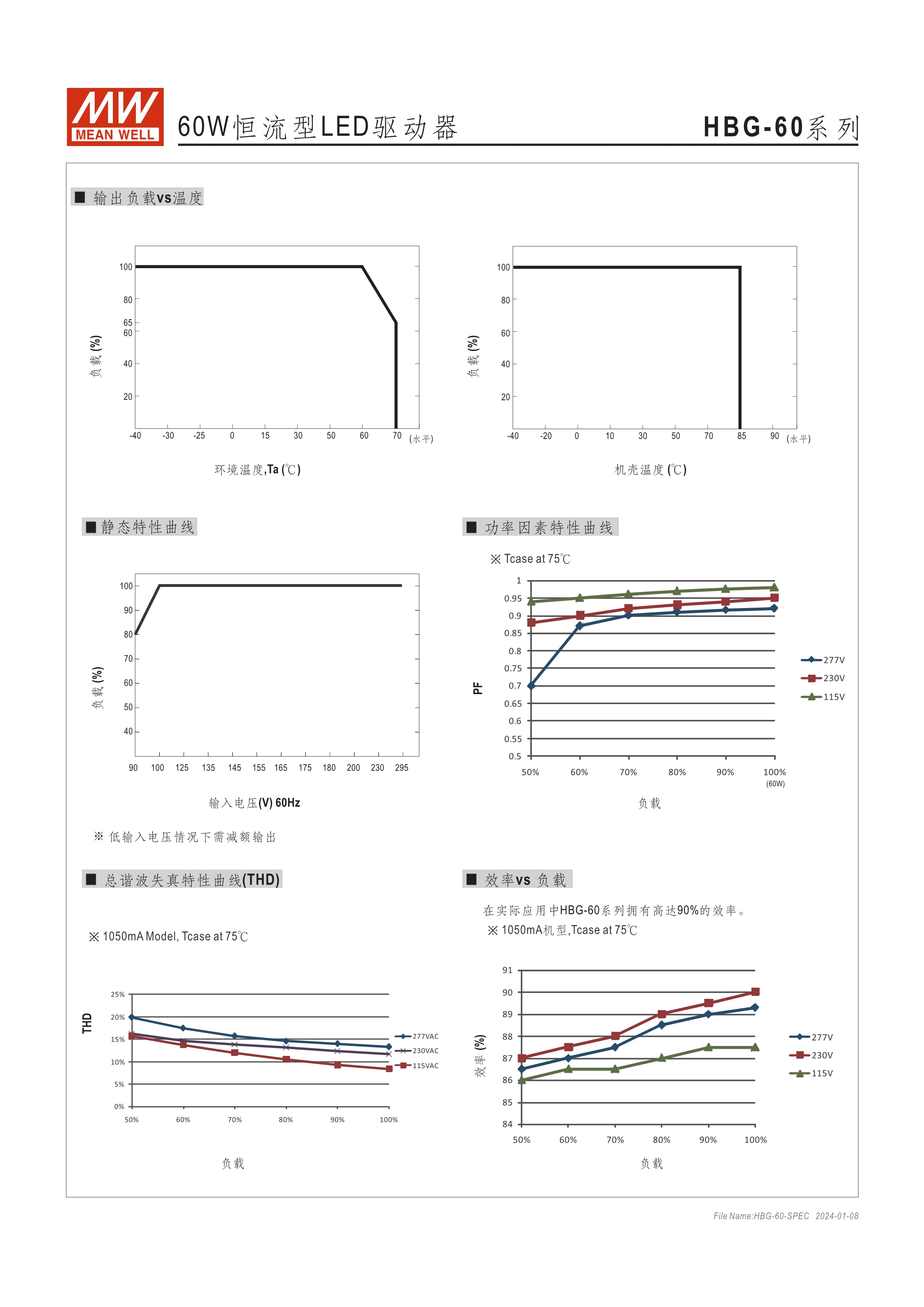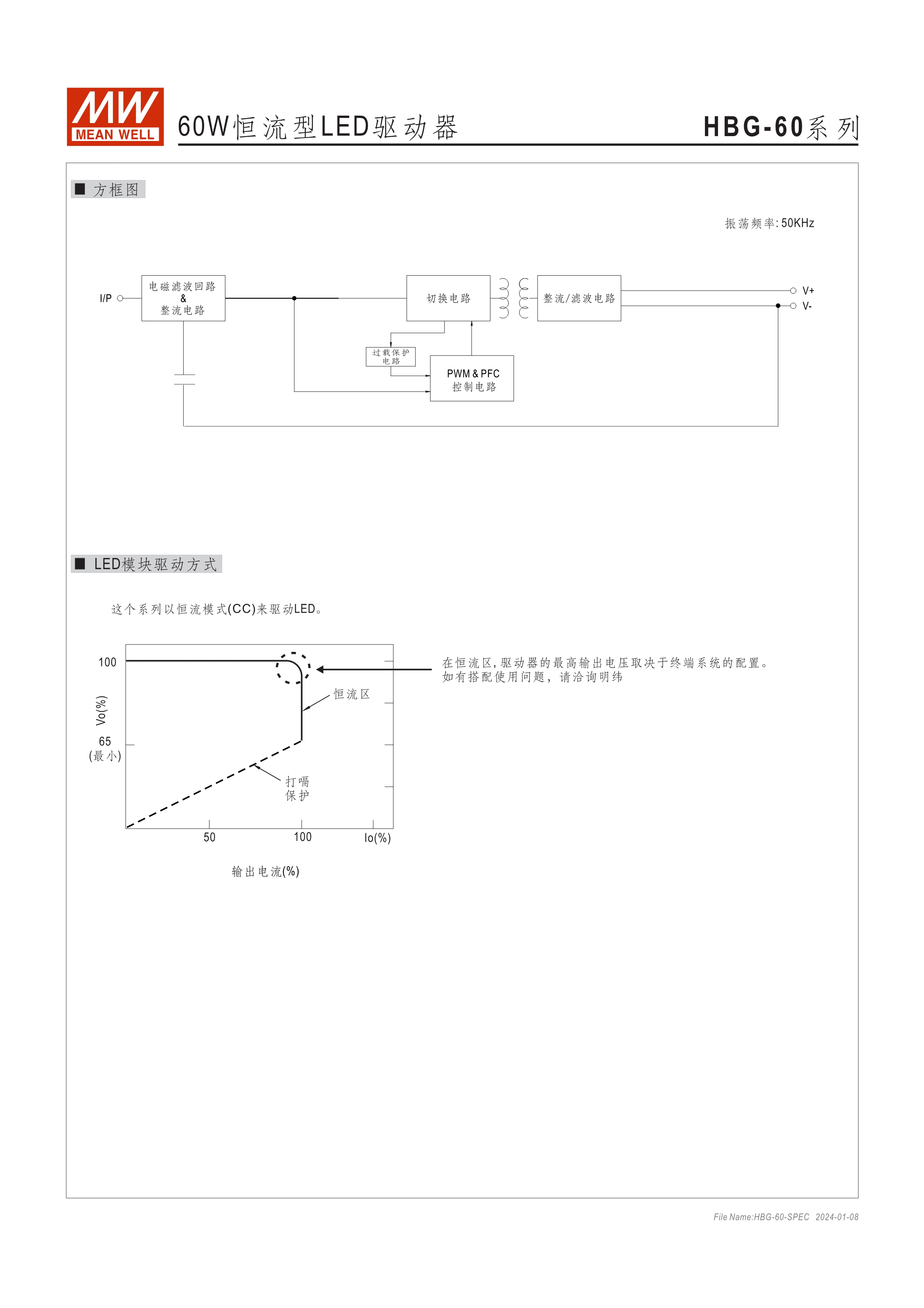 圓形外殼設(shè)計(jì) : HBG-60 :塑料外殼; HBG-100/160/240 :金屬外殼; HBG-60P/100P/160P/240P : PCB板型 90~305VAC交流輸入(HBG-60為90~295VAC), 內(nèi)建主動(dòng)式功率因子矯正功能(active PFC) IP67/IP65防護(hù)等級(jí)可用于戶外與室內(nèi)(HBG-100/160/240) HBG-100(P)/160(P)/240(P) B Type機(jī)種內(nèi)建三合一調(diào)光功能 (1~10VDC,PWM信號(hào)或電阻) Type "HL" LED電源適用在安裝于Class I, Division 2 類 危險(xiǎn)地點(diǎn)之照明燈具(HBG-100/160) 適合于LED天井燈、舞臺(tái)燈、投光燈等照明應(yīng)用 5年保固期