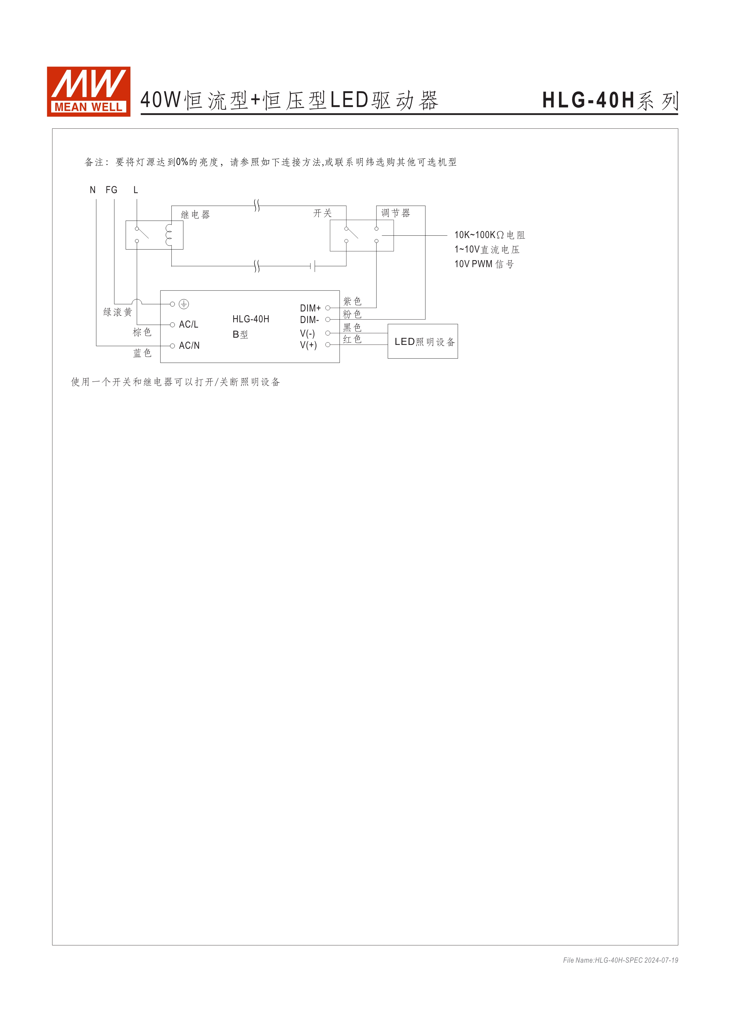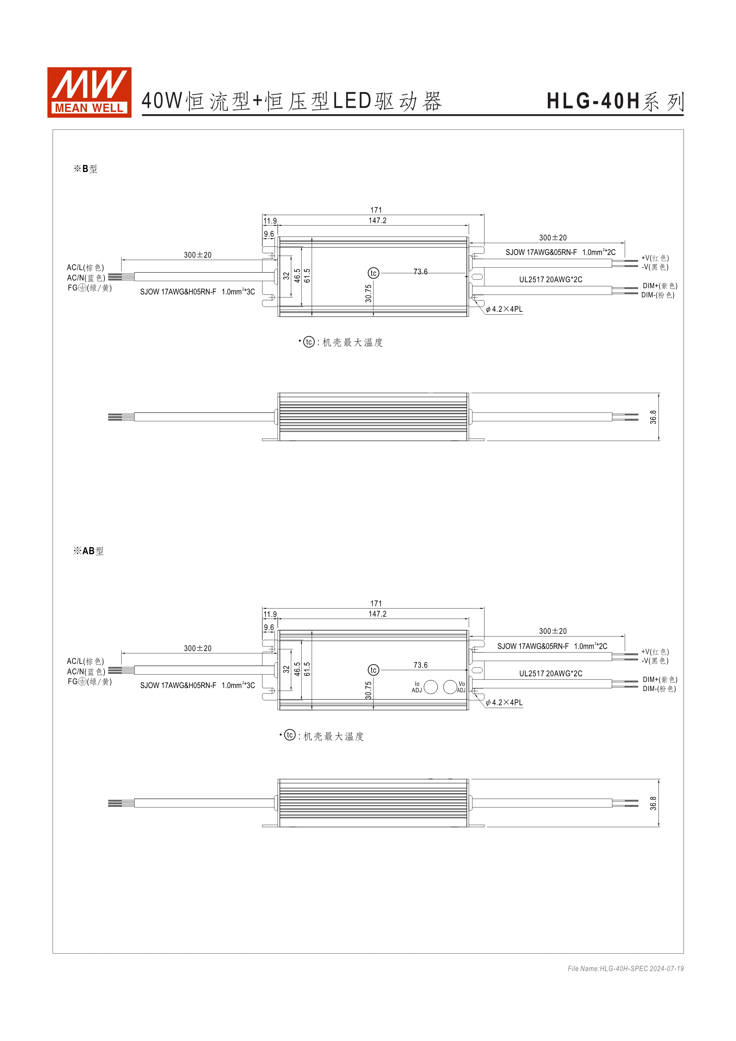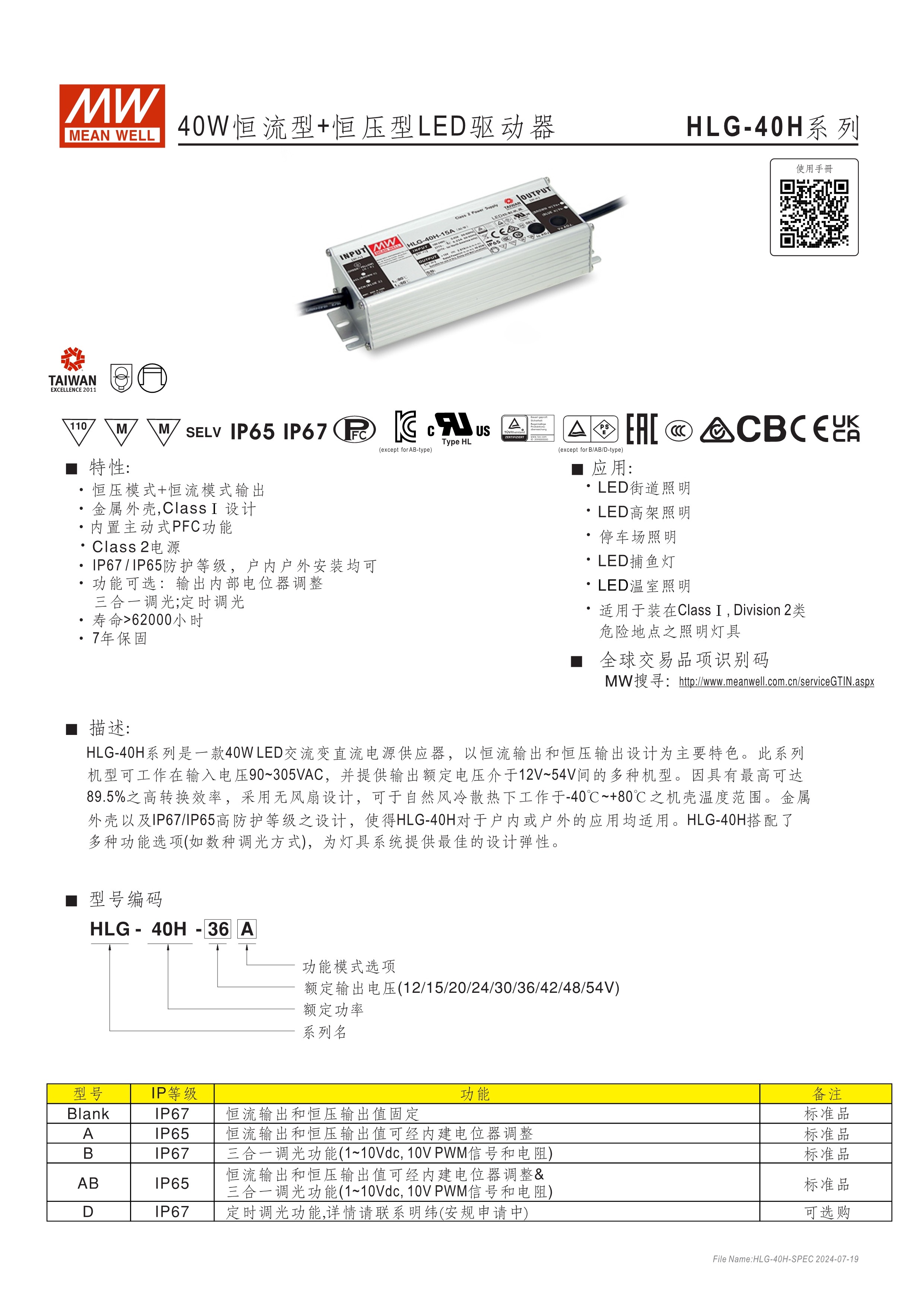 90~305VAC交流輸入,內(nèi)建主動式功率因子矯正功能(active PFC) 96%超高效率(HLG-600H) 金屬外殼,IP67/IP65防護等級可用于戶外與室內(nèi) 功能選項 : 輸出可經(jīng)由電位器調(diào)整;三合一調(diào)光(1~10Vdc或10V PWM信號或電阻);定時調(diào)光 Type "HL" LED電源適用在安裝于Class I, Division 2 類 危險地點之照明燈具 適合于LED路燈、戶外照明及需求高IP防護等級之戶外應(yīng)用 另有IP68/-55℃開機/10G震動承受能力等選項(細節(jié)請與明緯聯(lián)系) 7年保固期