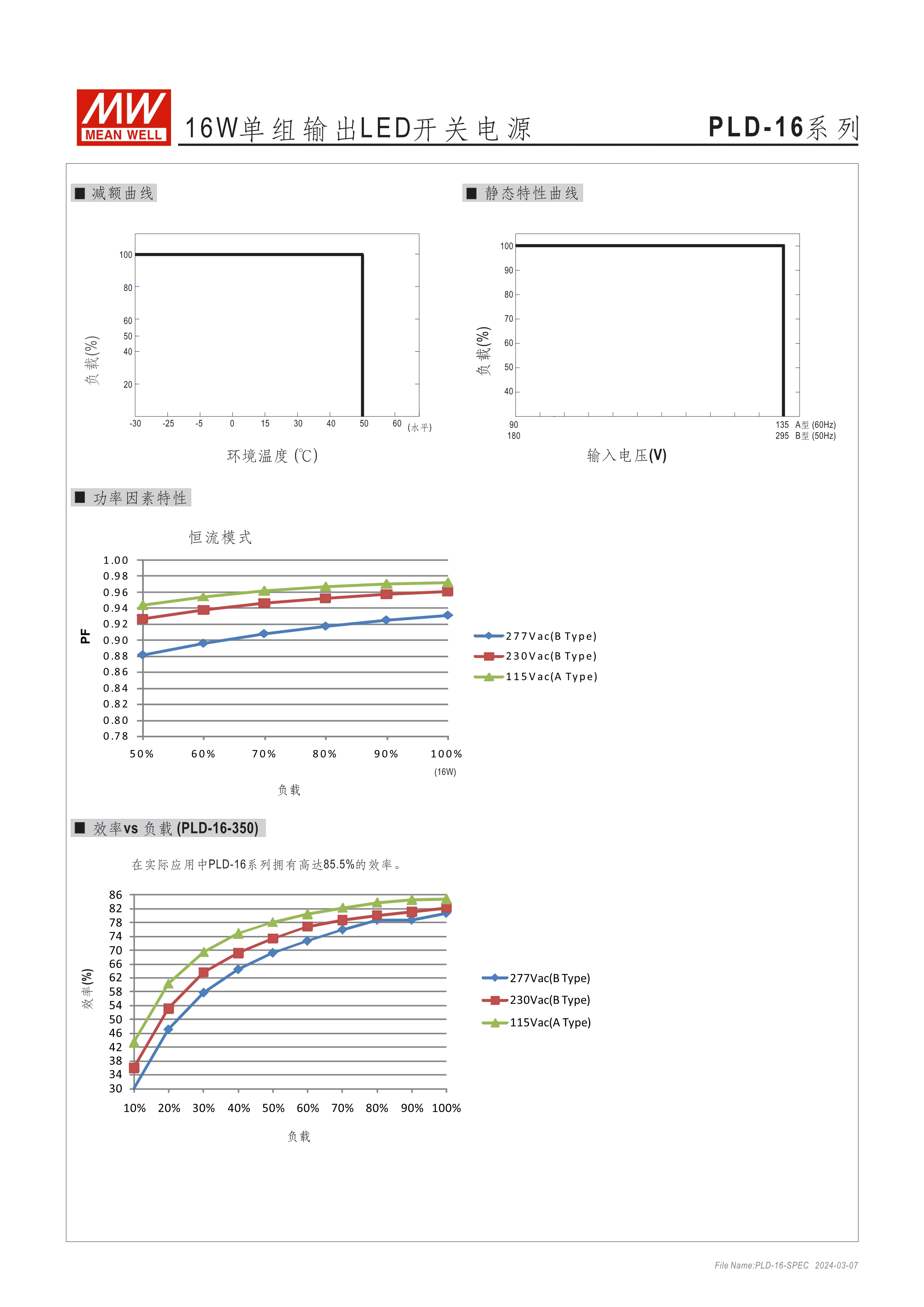 16W: 90~135VAC或180~295VAC 25W: 90~295VAC 40/60W: 180~295VAC 內建主動式功率因子矯正功能(active PFC) 塑料外殼,IP42防護等級 Class II設計,無FG 恒流設計 適合于LED室內照明相關應用