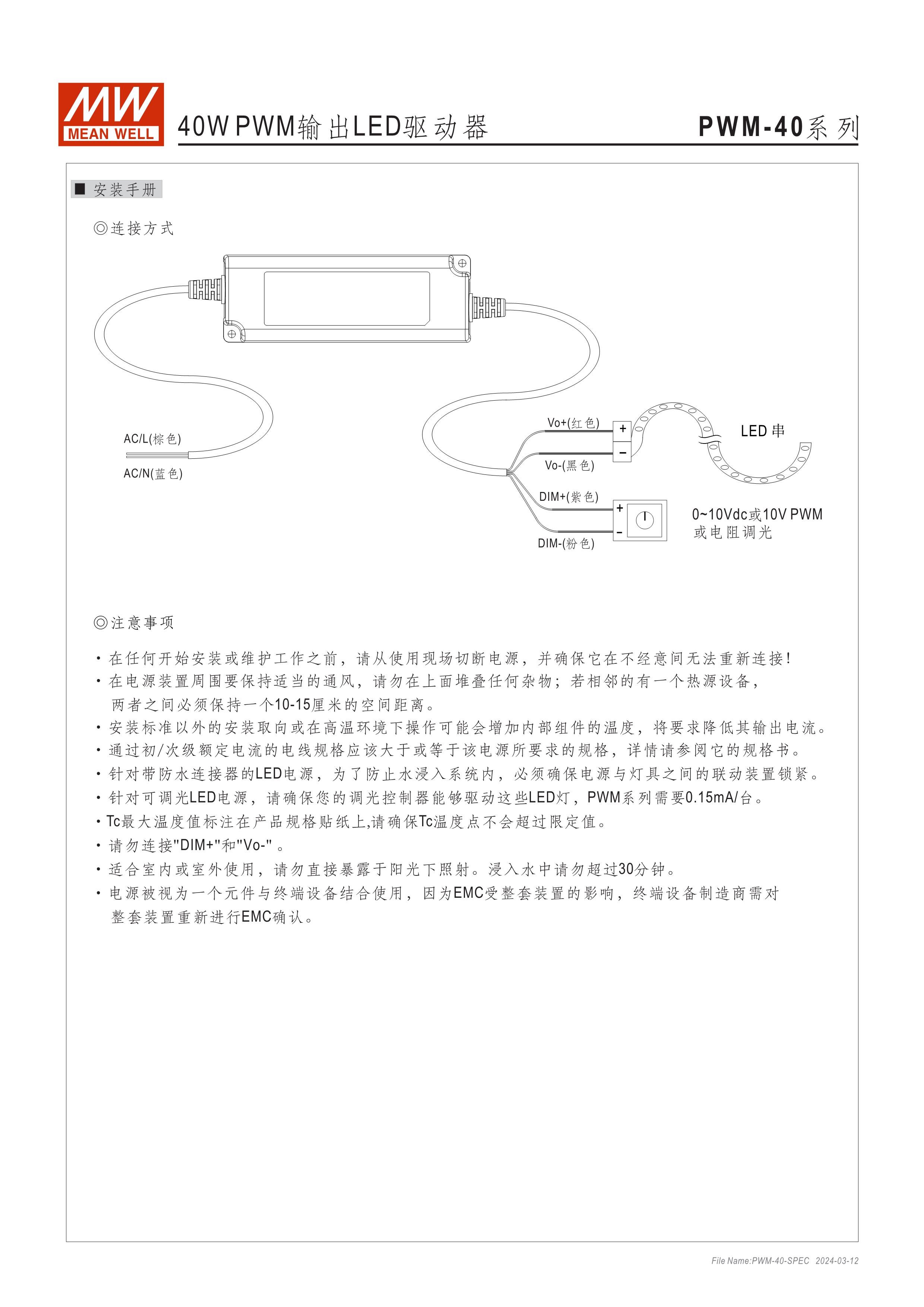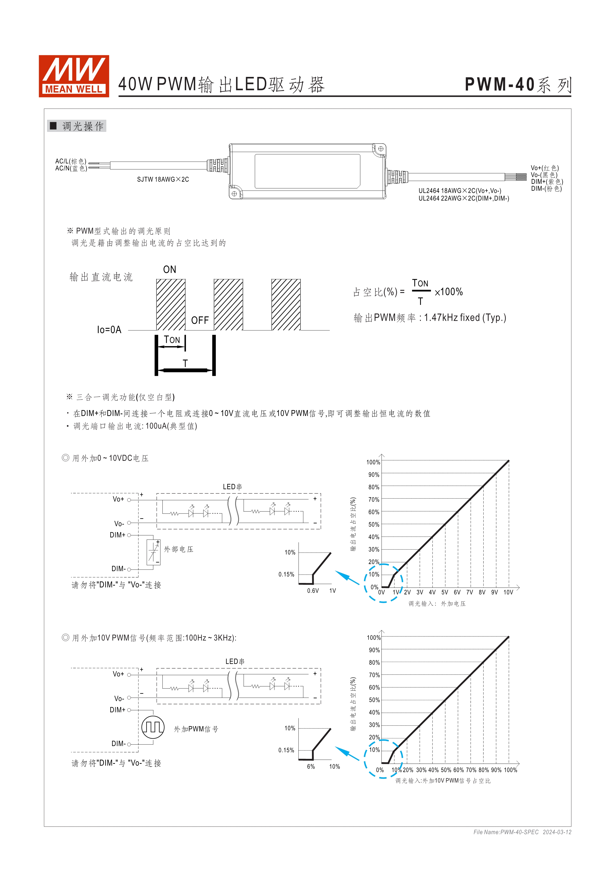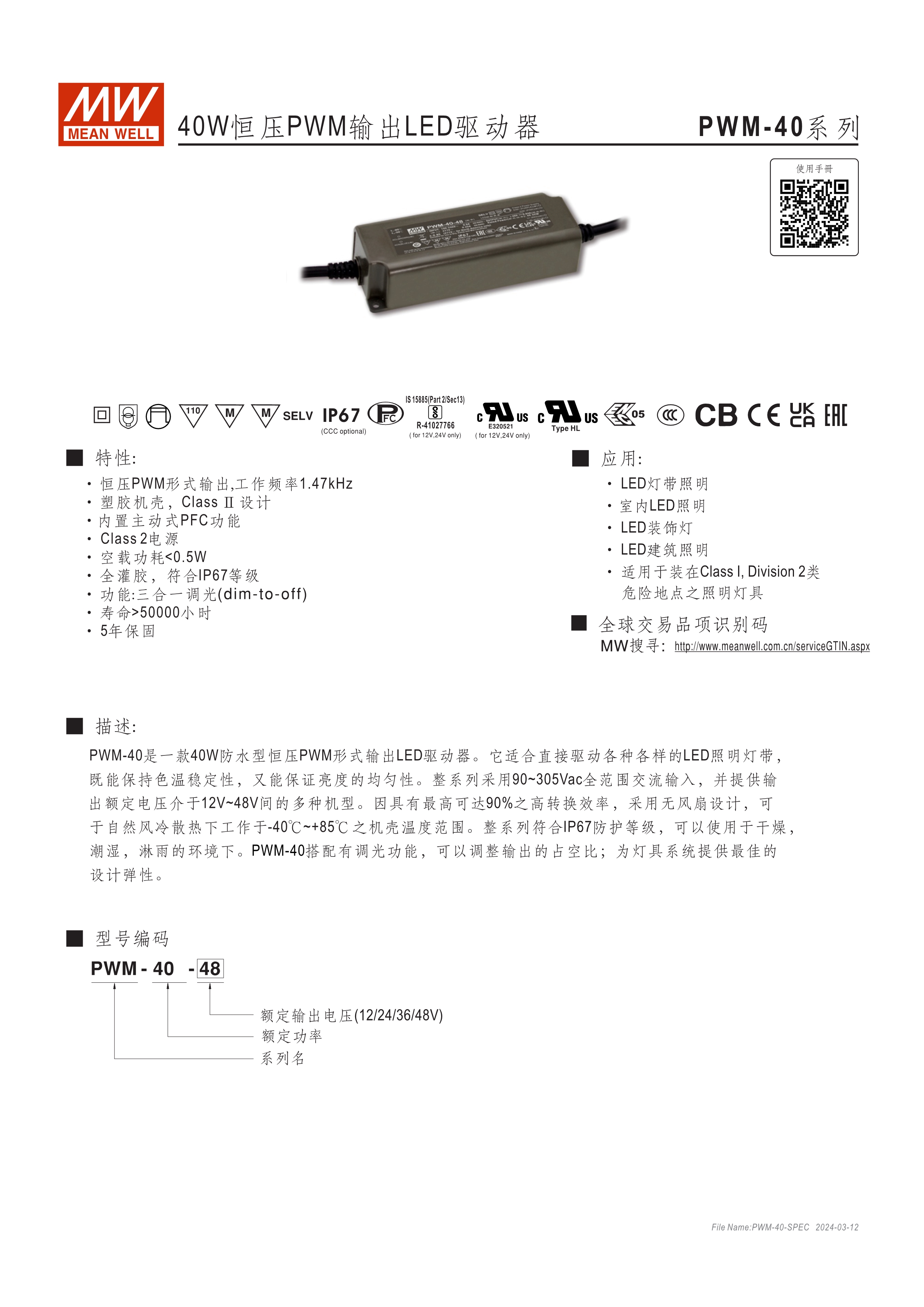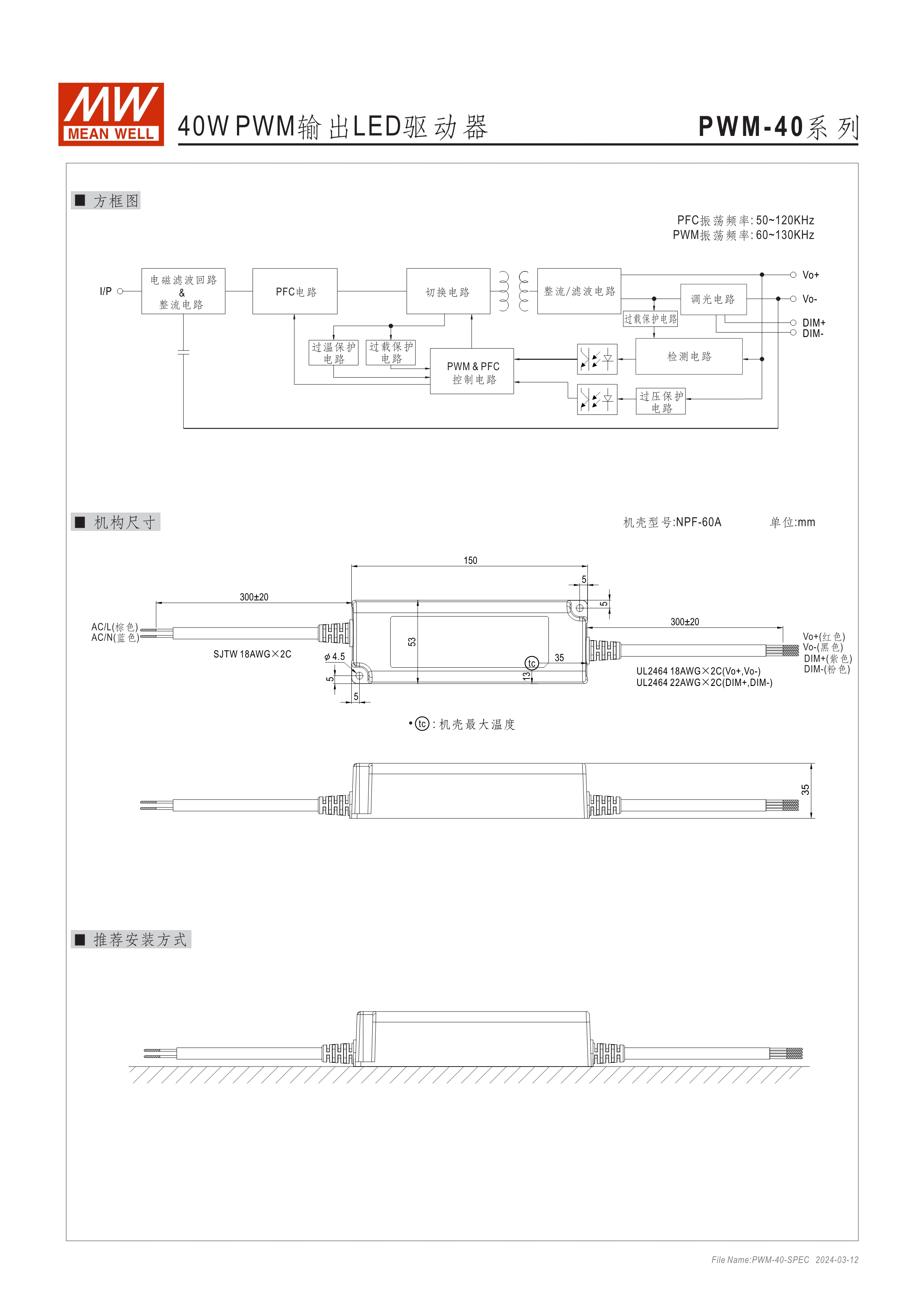 90~305VAC交流輸入, 內(nèi)建主動(dòng)式功率因子矯正功能(active PFC) 塑料外殼,IP67防護(hù)等級(jí) 恒壓PWM輸出 Class II設(shè)計(jì),無FG 空載待機(jī)消耗瓦數(shù)<0.5W 內(nèi)建三合一調(diào)光功能(0~10VDC, PWM信號(hào)或電阻,可關(guān)斷) 5年保固期