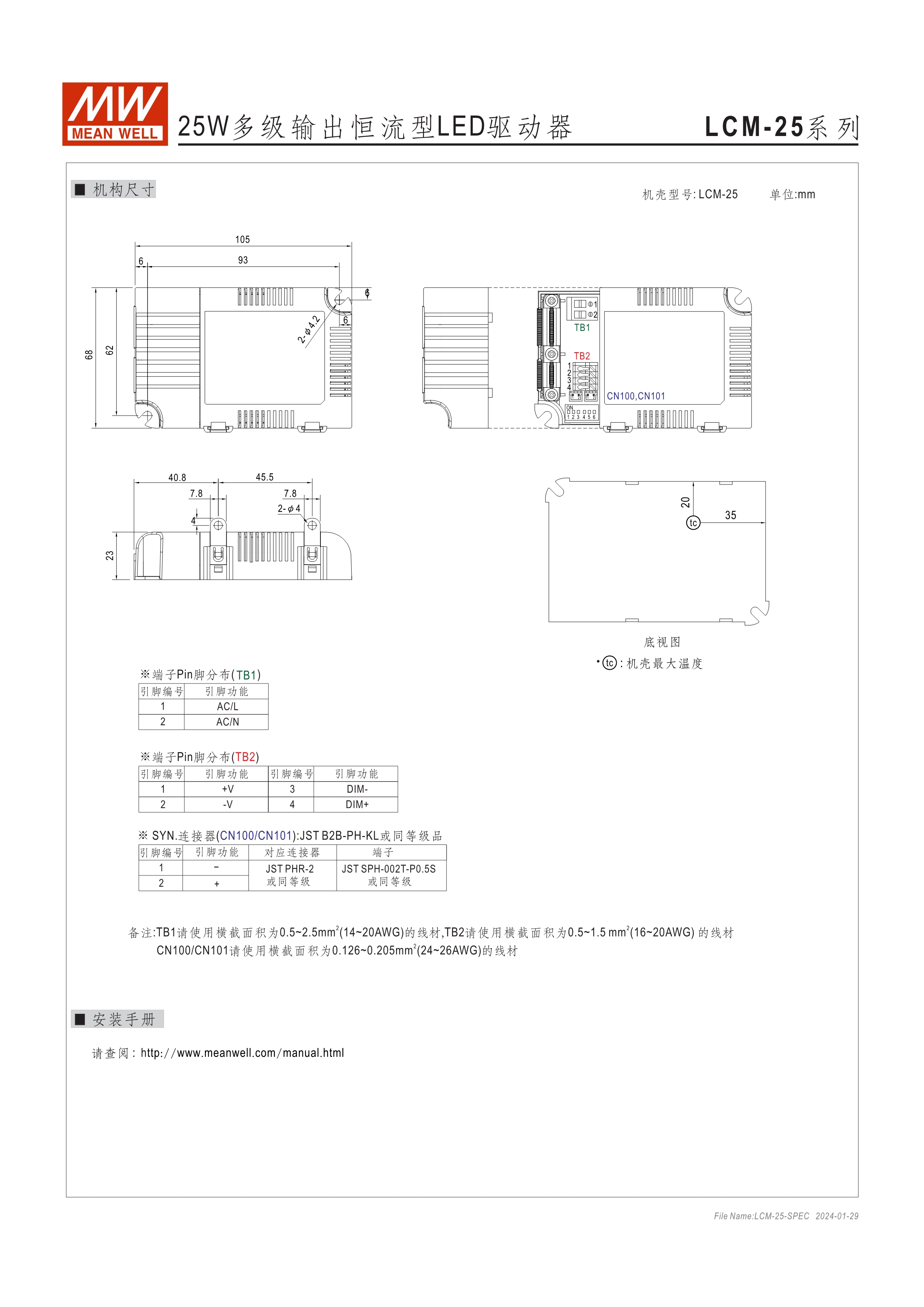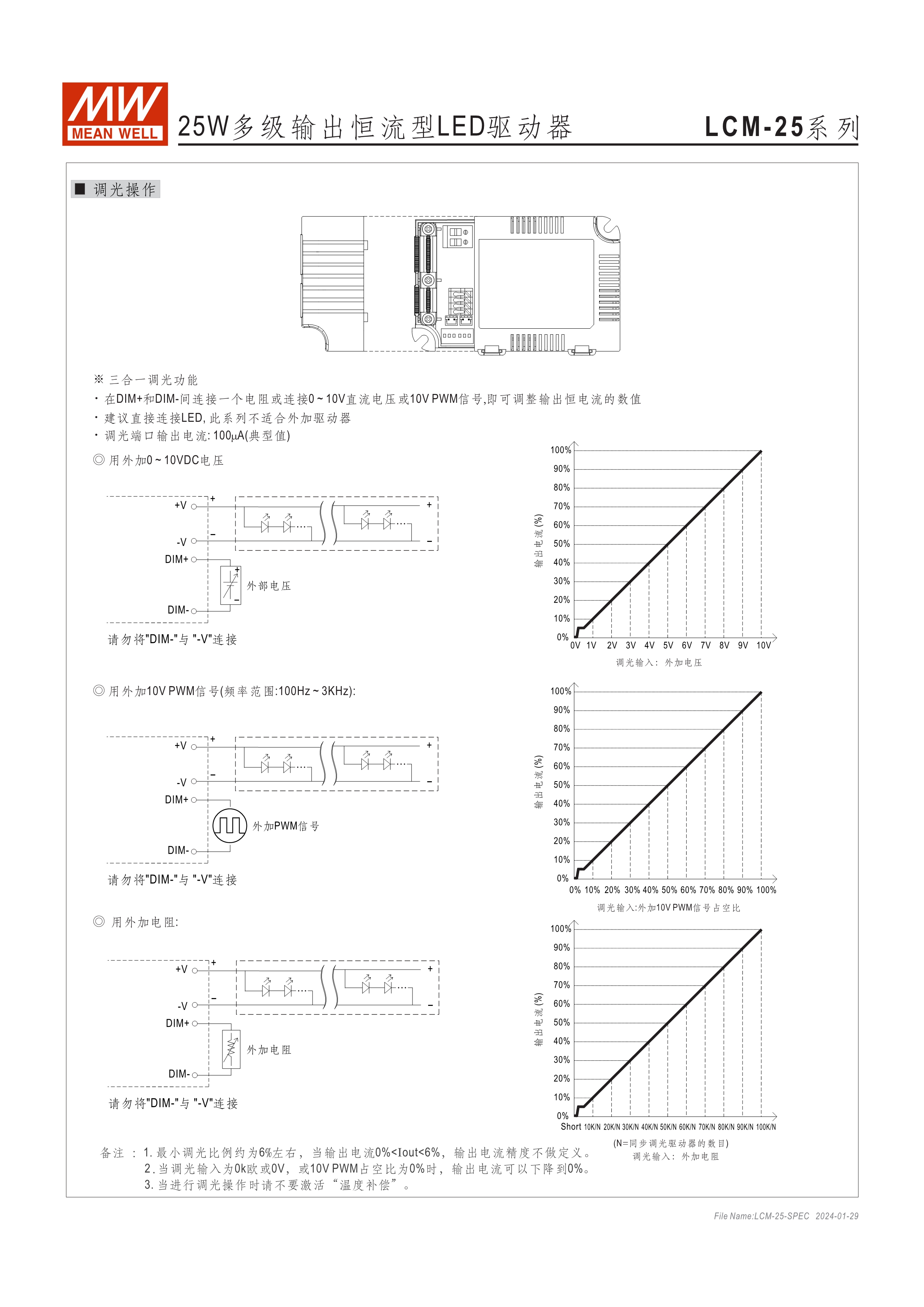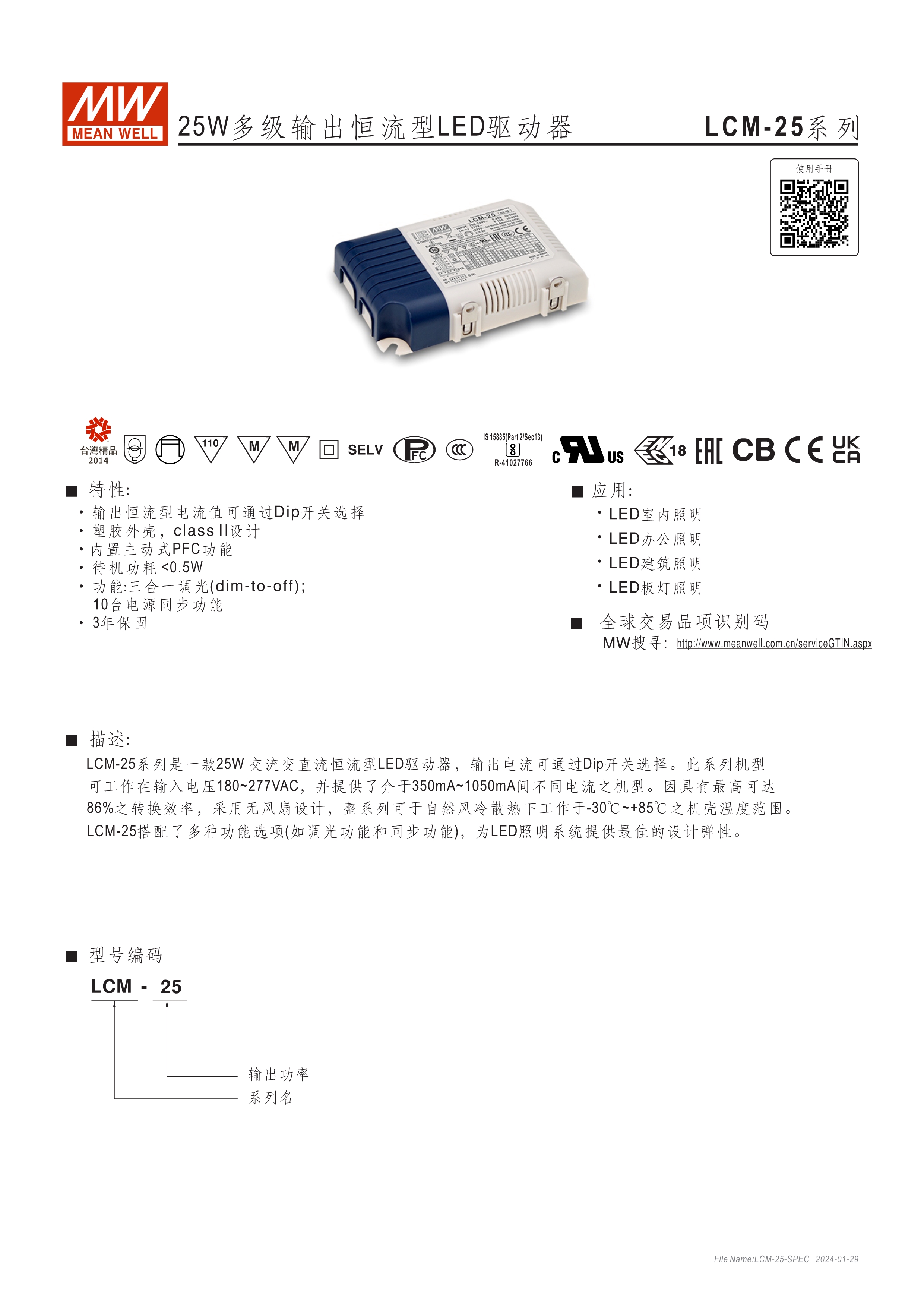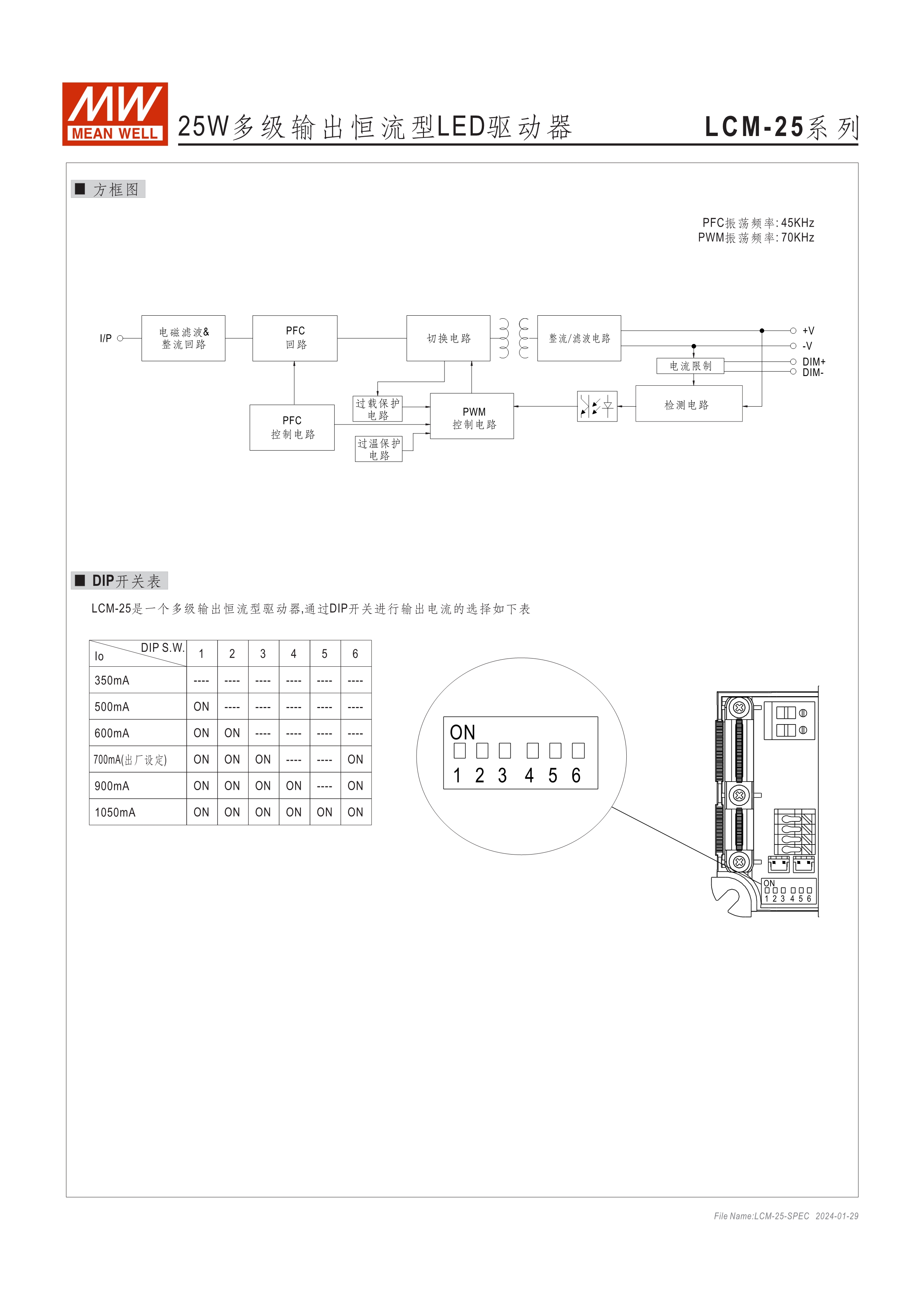 LCM-25(DA):180~277VAC交流輸入, LCM-40(DA)/60(DA):180~295VAC交流輸入 內(nèi)建主動(dòng)式功率因子矯正功能(active PFC) 塑料外殼 可透過(guò)指撥開(kāi)關(guān)切換不同輸出電流檔位之多段式電源 LCM-25/40/60內(nèi)建三合一調(diào)光功能(0~10VDC, PWM信號(hào)或電阻,可關(guān)斷) LCM-25DA/40DA/60DA內(nèi)建DALI接口 和按鈕調(diào)光功能(Push Dim) LCM-40TW為2路輸出支持可溫(DT8)及調(diào)光(DT6)應(yīng)用 適合于LED室內(nèi)照明相關(guān)應(yīng)用