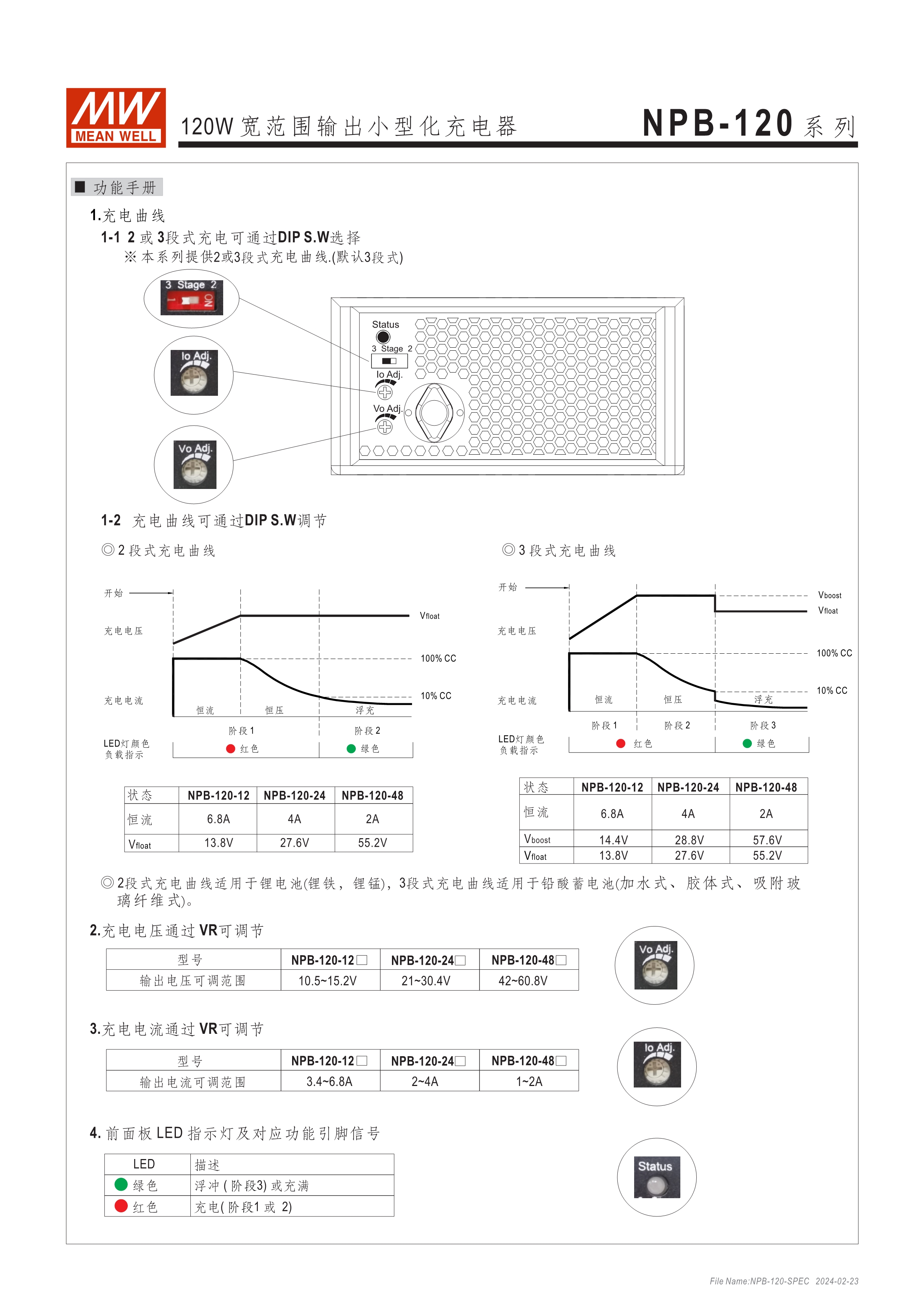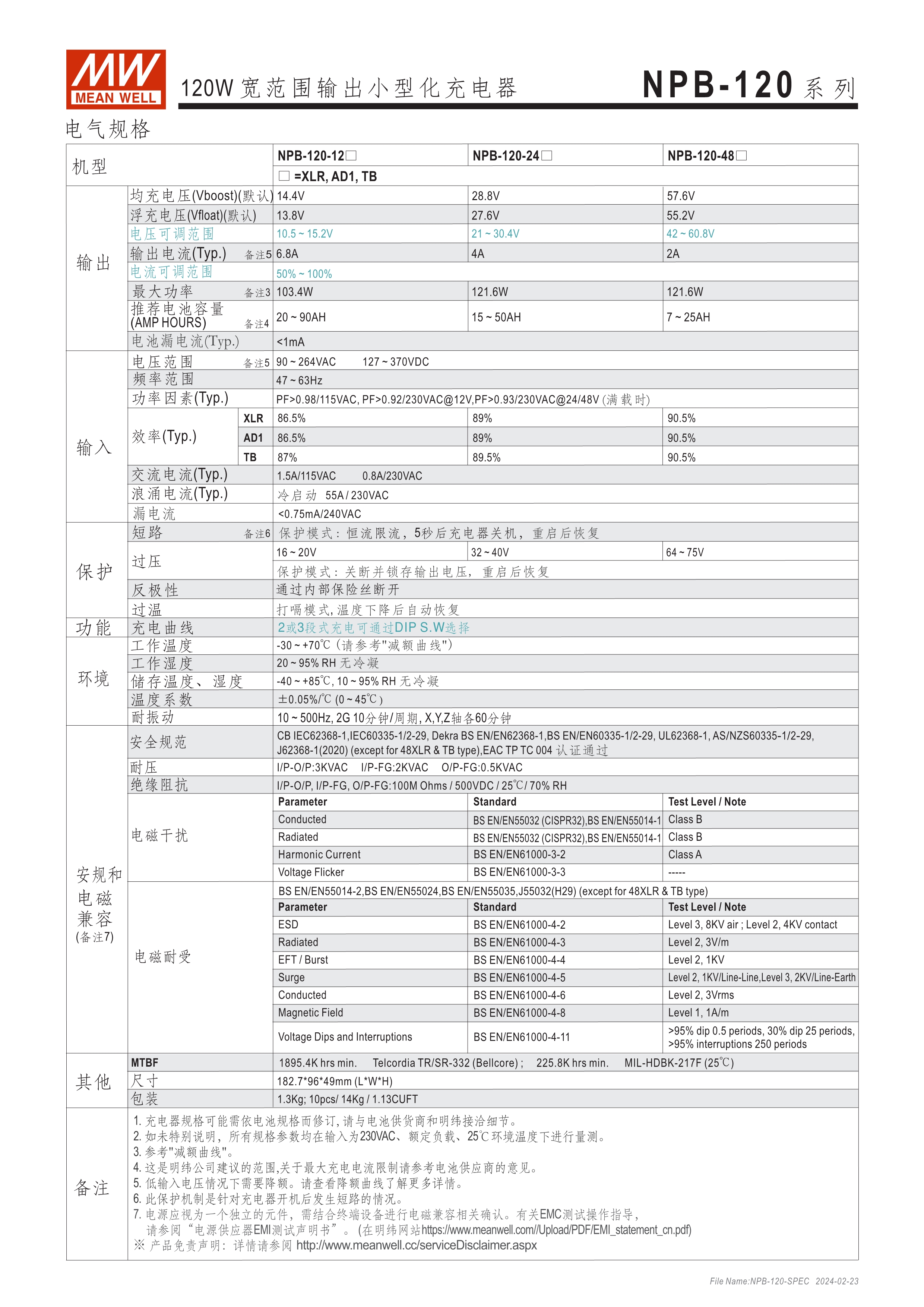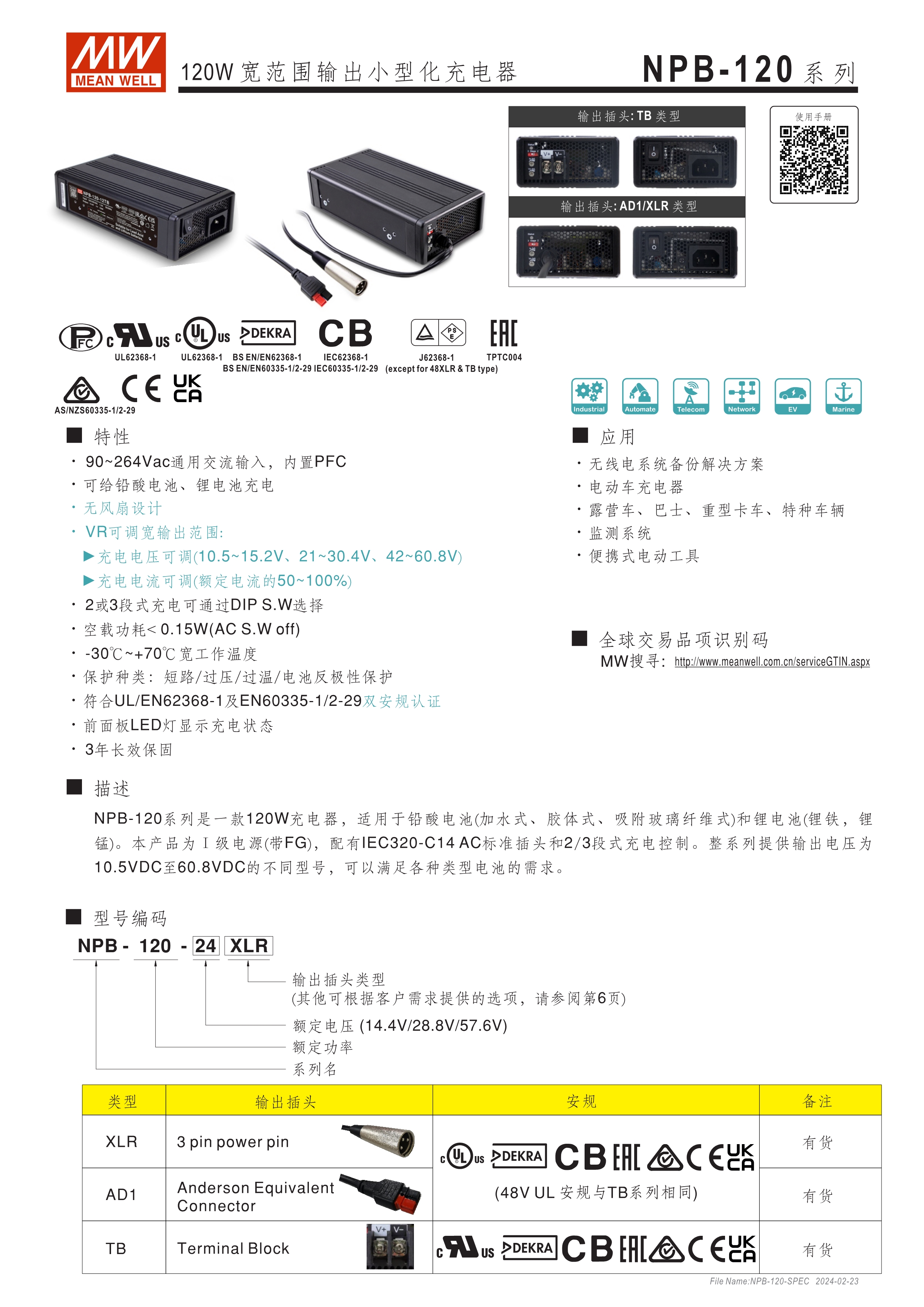 基礎型可靠耐用寬壓充電器 金屬殼散熱快、使用不燙手 可調(diào)功能簡便、使用彈性高: ? 可調(diào)充電電壓 (由面板調(diào)整10.5~15.2V, 21~30.4V, 42~60V) ? 可調(diào)充電電流 (由面板VR調(diào)整50~100%) ? 透過面板DIP Switch可選2段或3段充電 保護功能:短路、過壓、過溫度、電池反極性保護 通過UL/EN62368-1及IEC60335-1/2-29雙安規(guī)認證 DC輸出接頭多樣可選:Anderson、麥克風頭、端子臺 3年保固