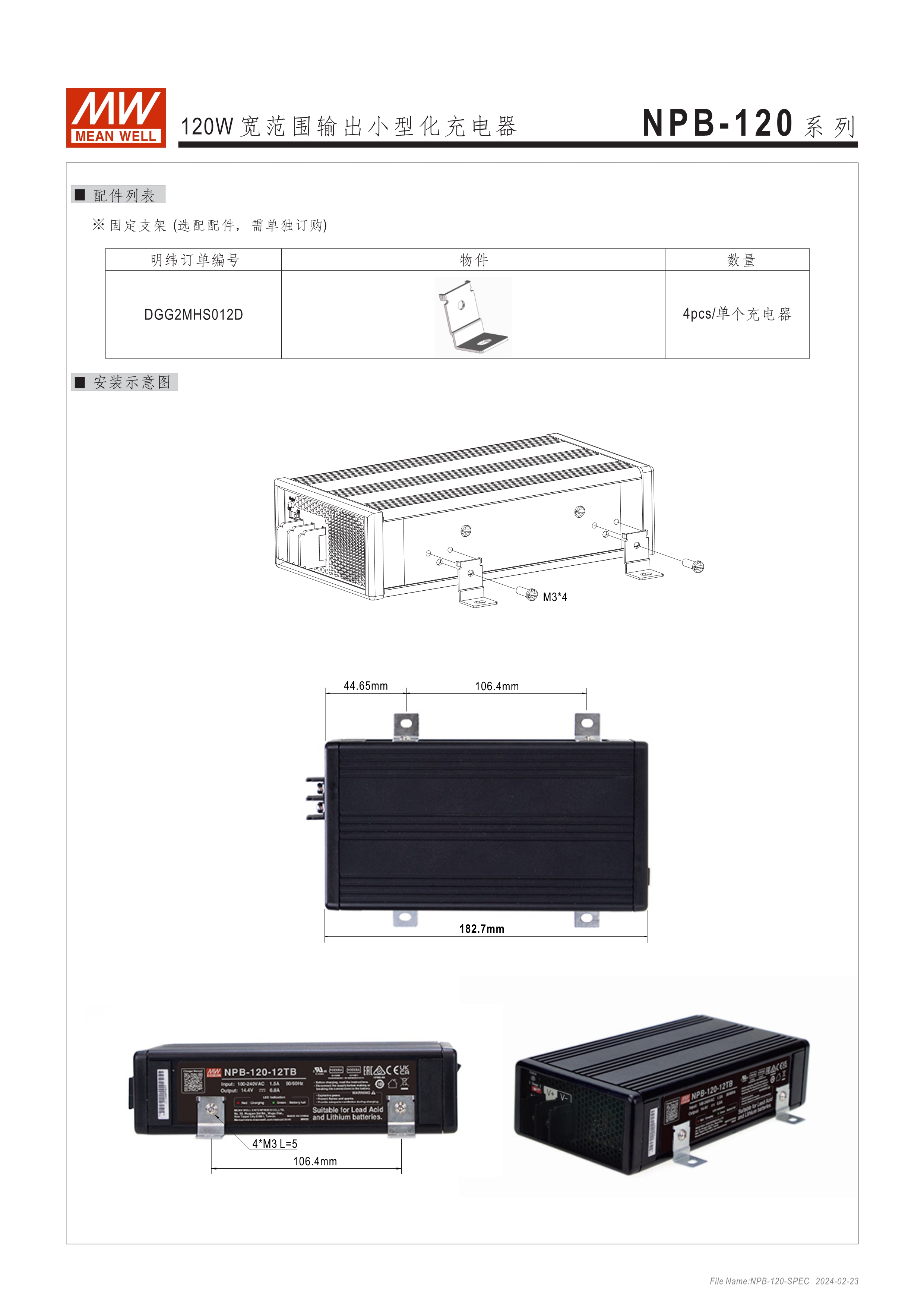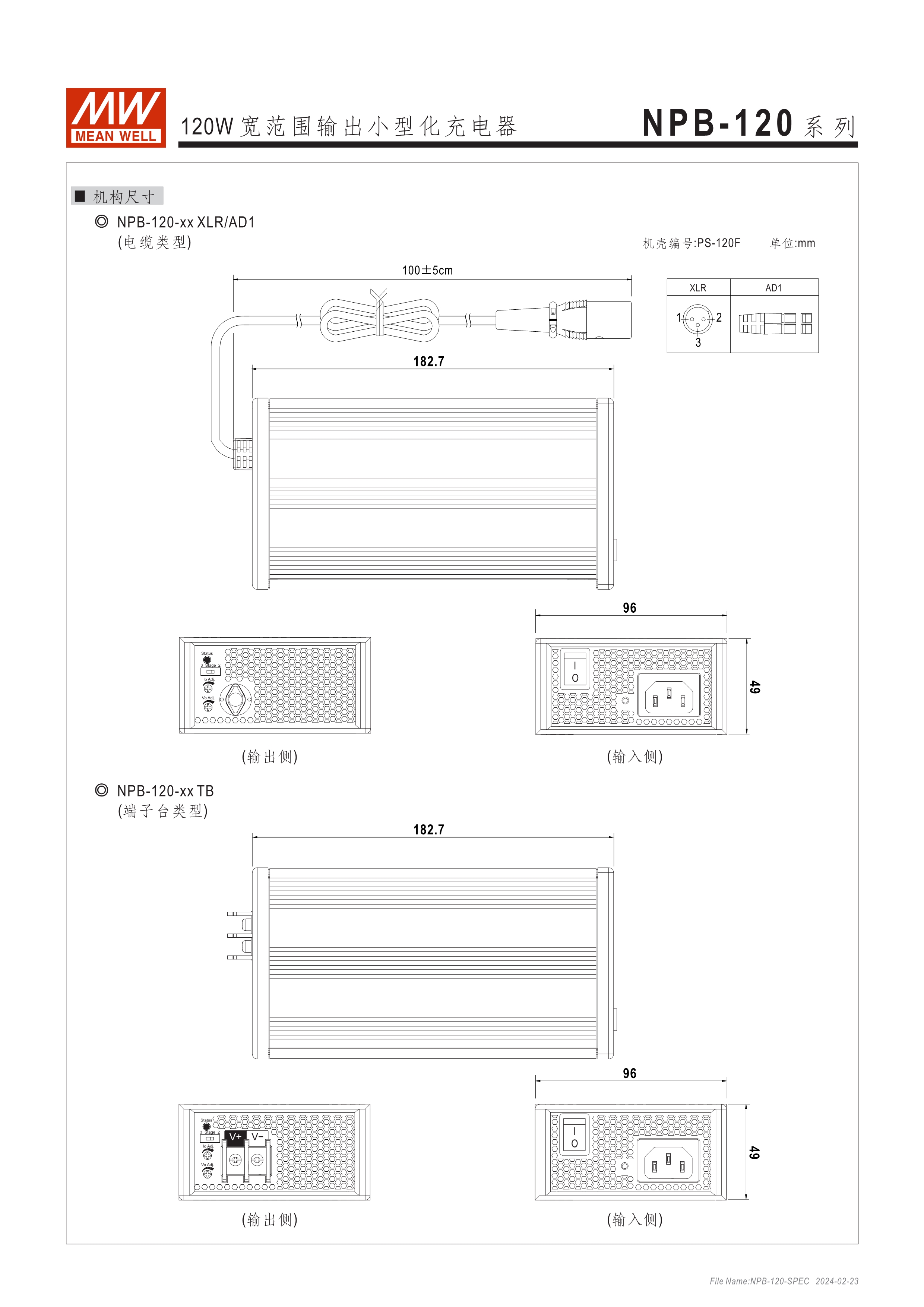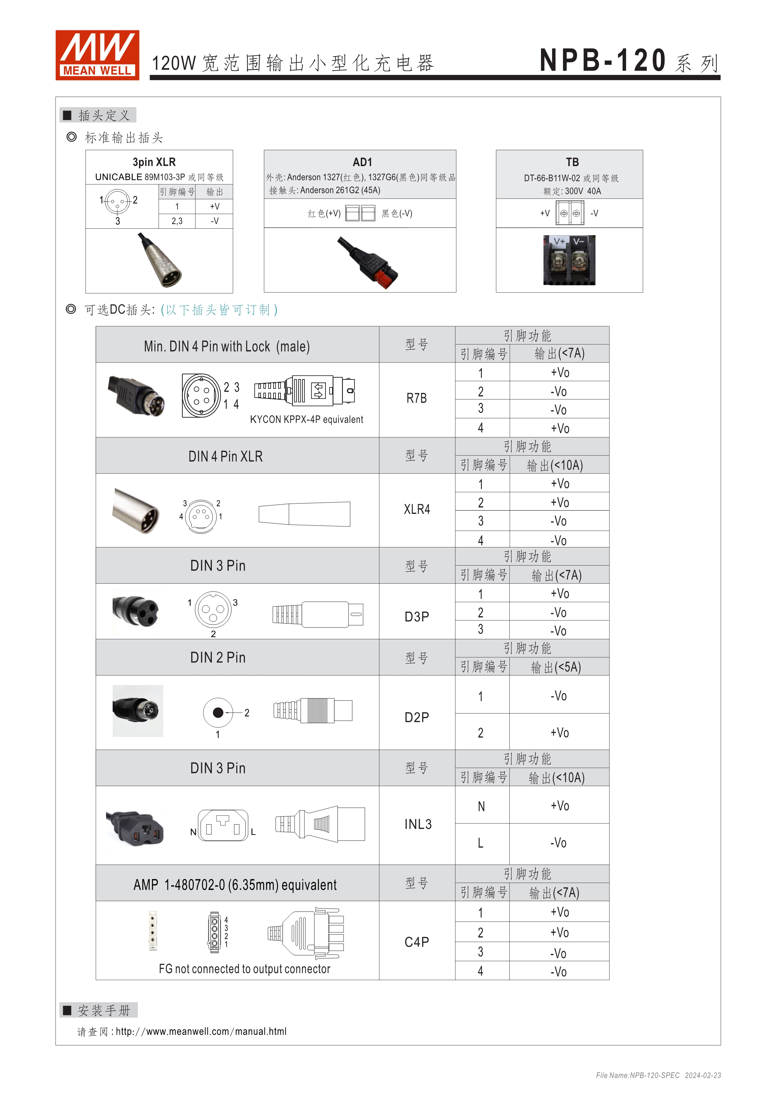 基礎型可靠耐用寬壓充電器 金屬殼散熱快、使用不燙手 可調(diào)功能簡便、使用彈性高: ? 可調(diào)充電電壓 (由面板調(diào)整10.5~15.2V, 21~30.4V, 42~60V) ? 可調(diào)充電電流 (由面板VR調(diào)整50~100%) ? 透過面板DIP Switch可選2段或3段充電 保護功能:短路、過壓、過溫度、電池反極性保護 通過UL/EN62368-1及IEC60335-1/2-29雙安規(guī)認證 DC輸出接頭多樣可選:Anderson、麥克風頭、端子臺 3年保固