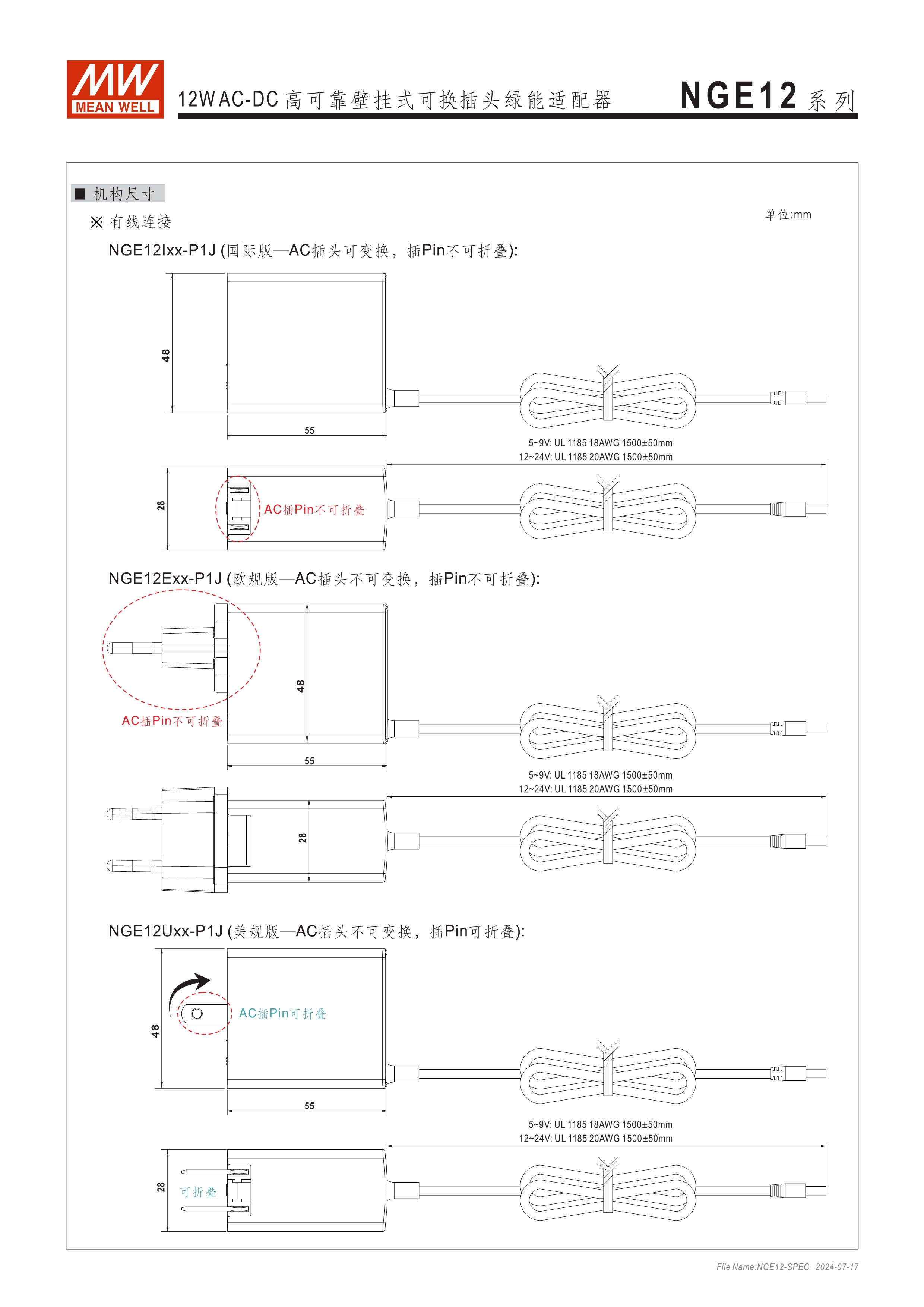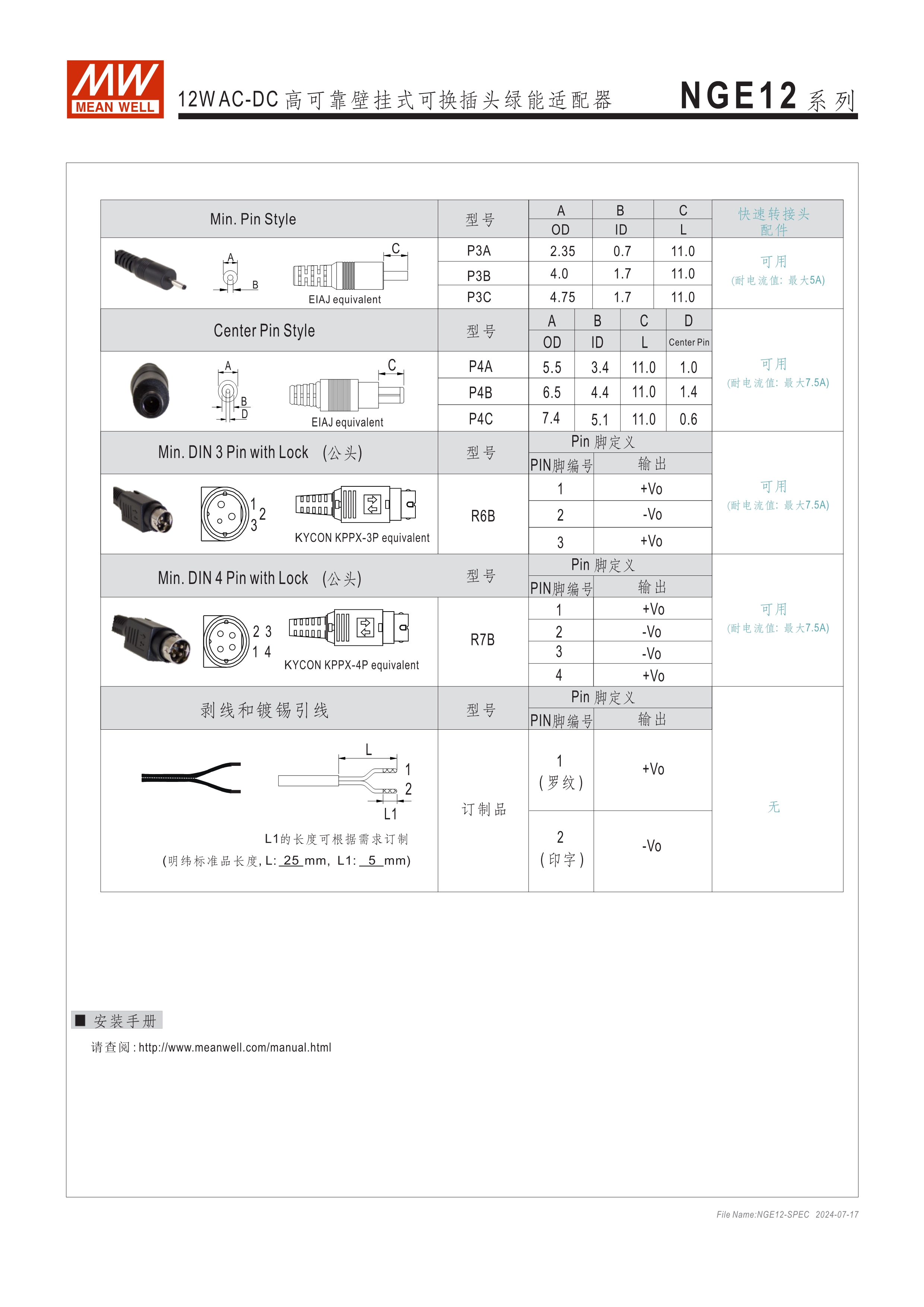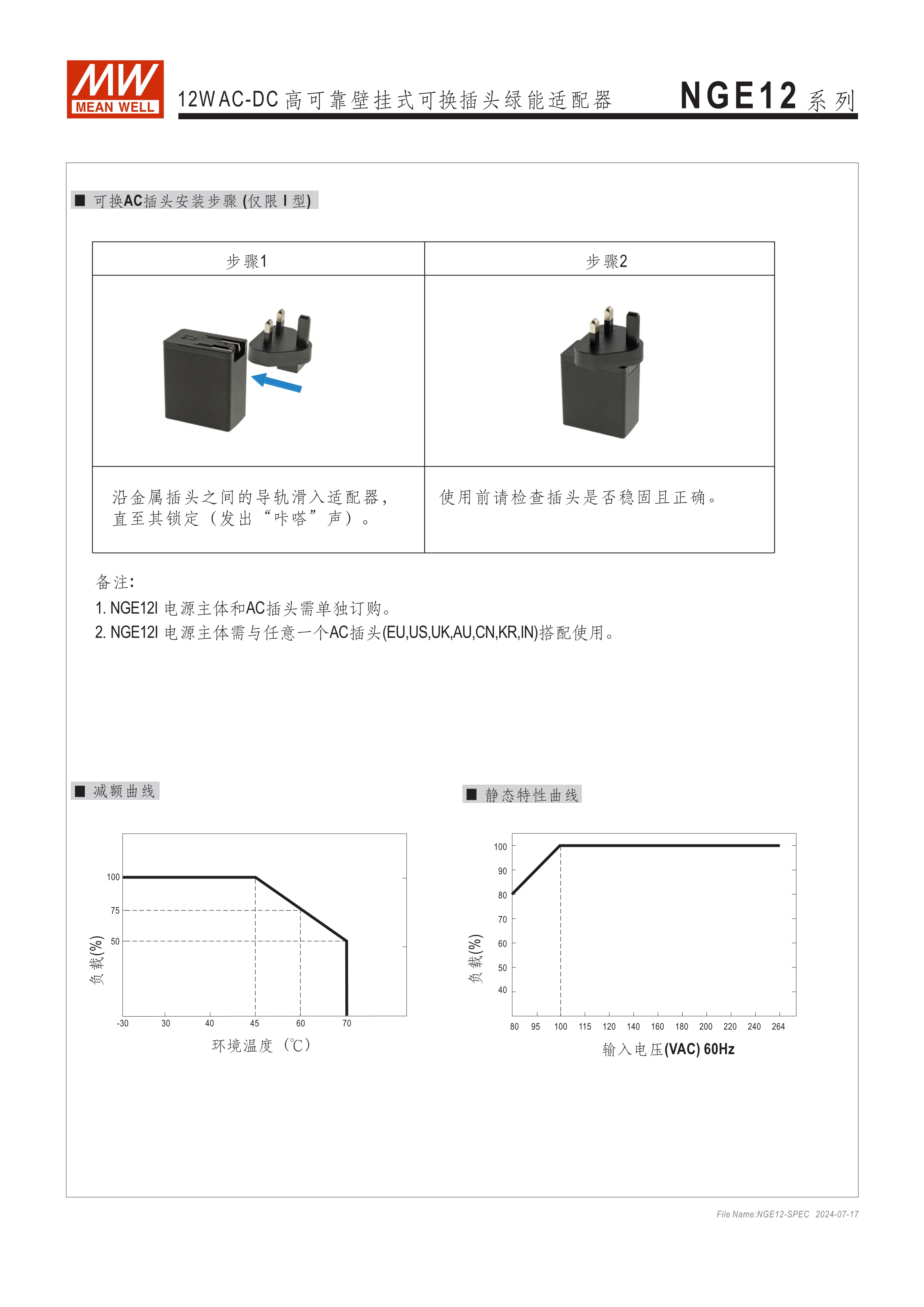 可換AC插頭 符合多領(lǐng)域全球認(rèn)證 (信息類 62368-1、醫(yī)療 60601-1, 家用 60335-1、工業(yè) 61558-1/-2-16) 全范圍AC輸入 2xMOPP, BF應(yīng)用 超窄面寬設(shè)計(28mm~30mm) 漏電流 <100uA 80~264V輸入 空載損耗<0.075W~0.1W 能效等級Level VII 保護(hù)功能:短路、過載、過電壓 漏電流 <100uA -30~70℃寬工作溫度 多種DC輸出轉(zhuǎn)接頭可更換 3年保固期