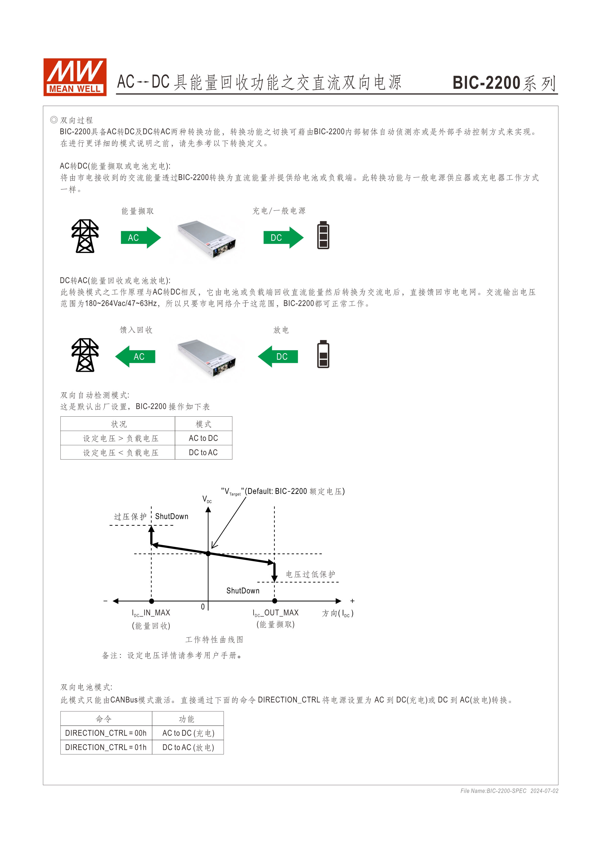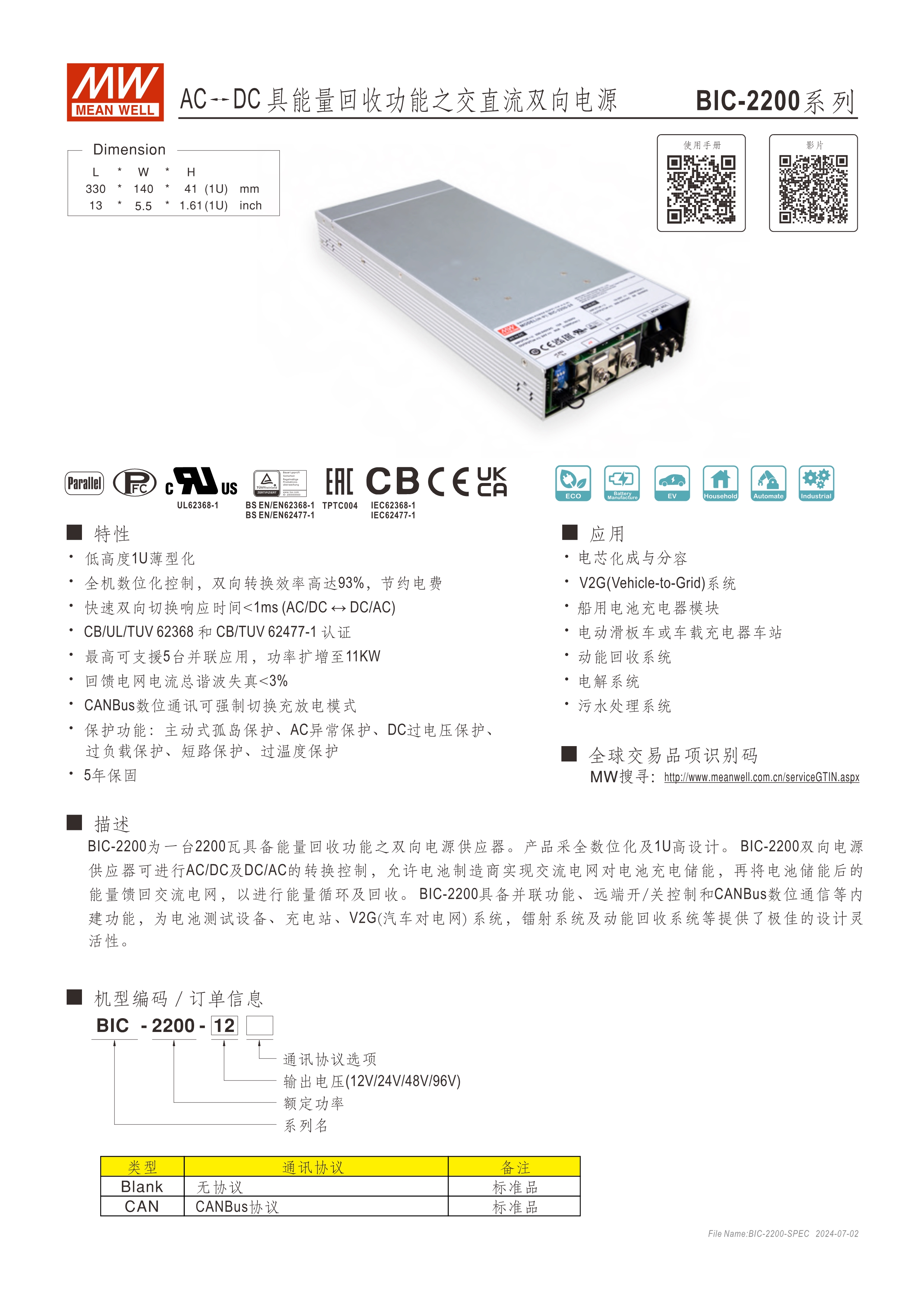 系統(tǒng)電源解決方案 (PDF) 低高度1U薄型化設(shè)計(jì) 全機(jī)數(shù)字化控制,雙向轉(zhuǎn)換效率高達(dá)93% 快速雙向切換響應(yīng)時(shí)間<1ms (AC/DC ? DC/AC) CB/UL/TUV 62368法規(guī)認(rèn)證,電路設(shè)計(jì)符合IEC 62477法規(guī) 最高可支持5臺(tái)并聯(lián)應(yīng)用,功率擴(kuò)增至11kW 回饋電網(wǎng)電流總諧波失真<3% 數(shù)字通訊可強(qiáng)制切換充放電模式(選配CANBus機(jī)型) 保護(hù)功能:主動(dòng)式孤島保護(hù)、AC異常保護(hù)、DC過(guò)電壓保護(hù)、過(guò)負(fù)載保護(hù)、短路保護(hù)、過(guò)溫度保護(hù) 5年保固