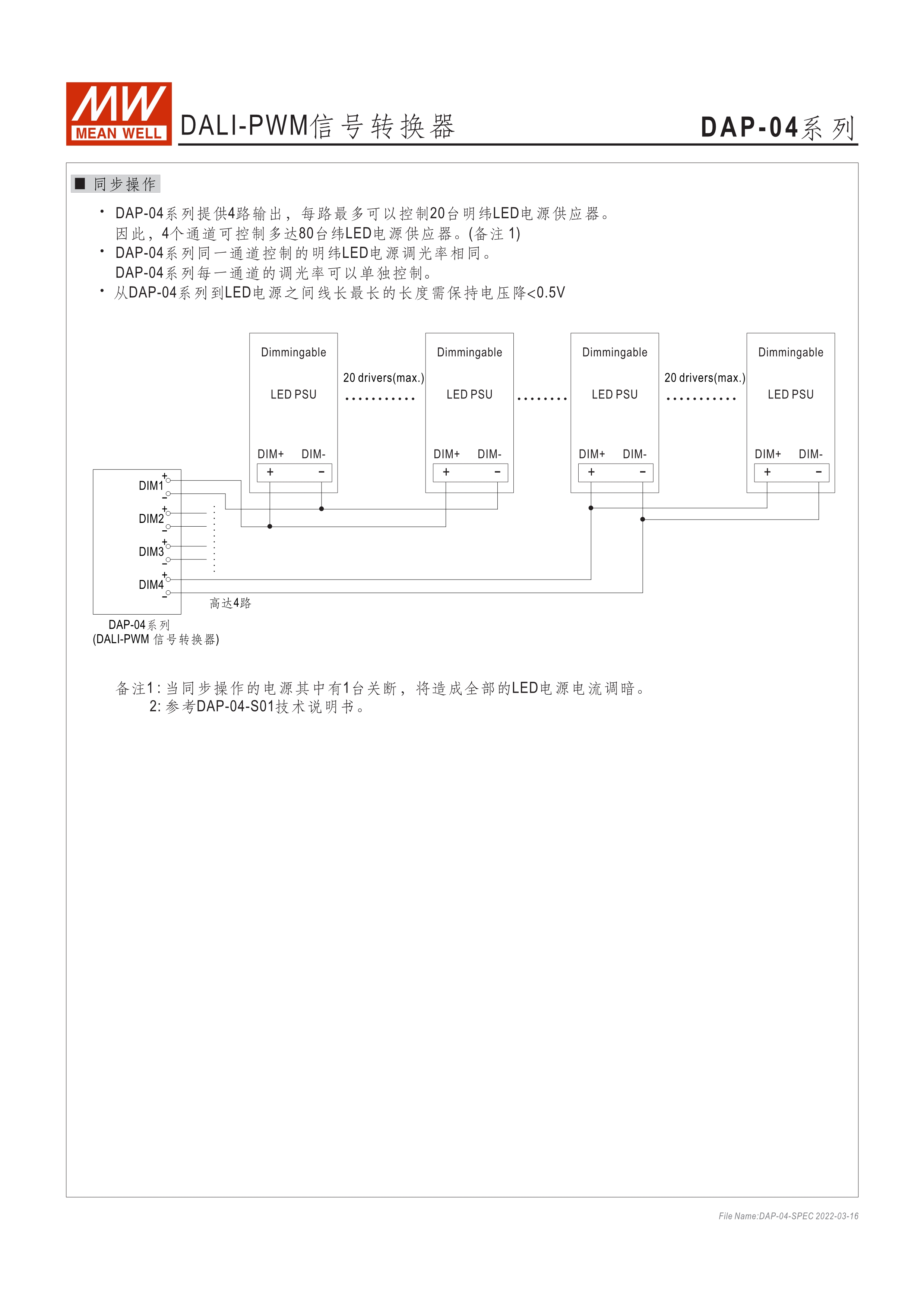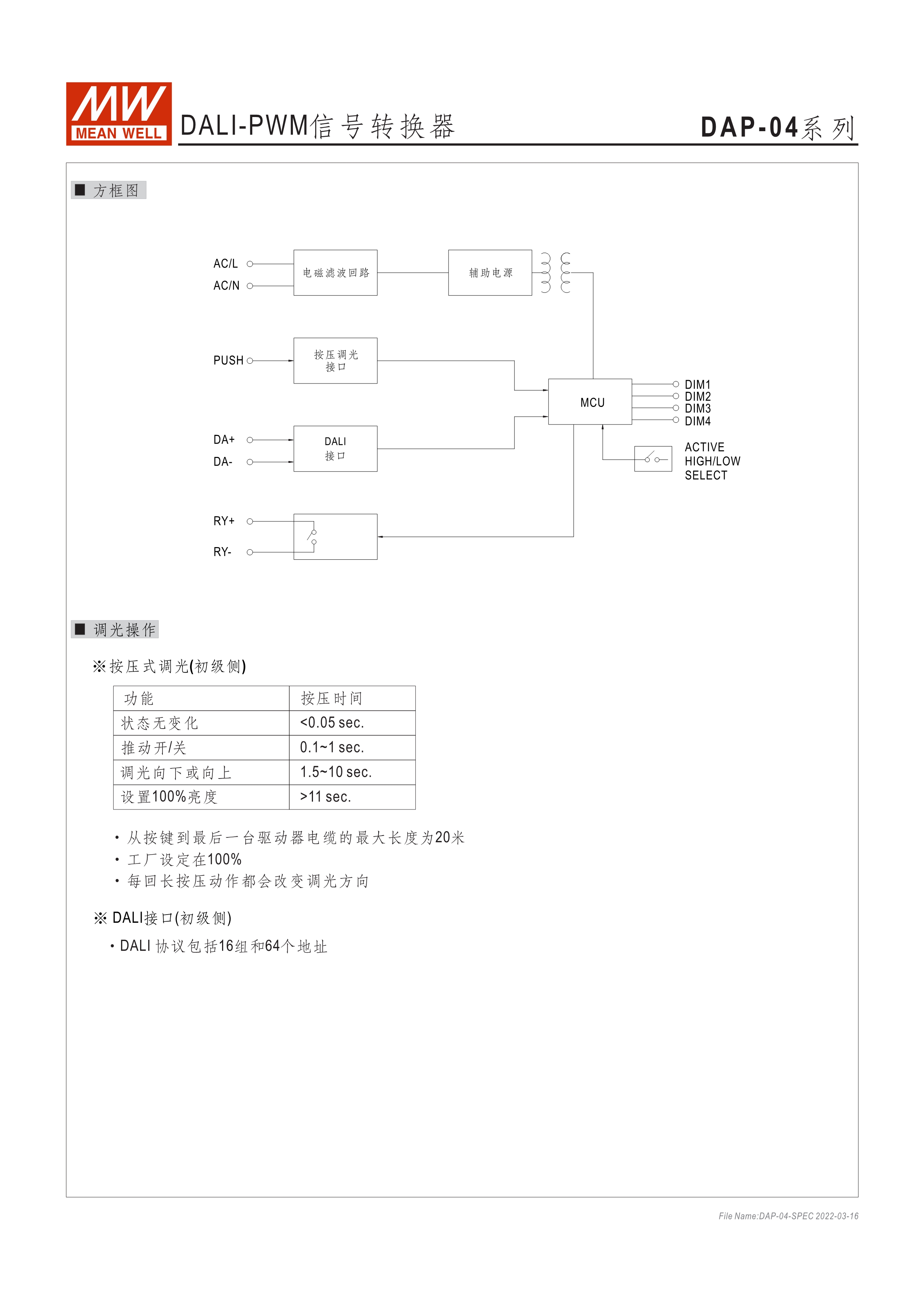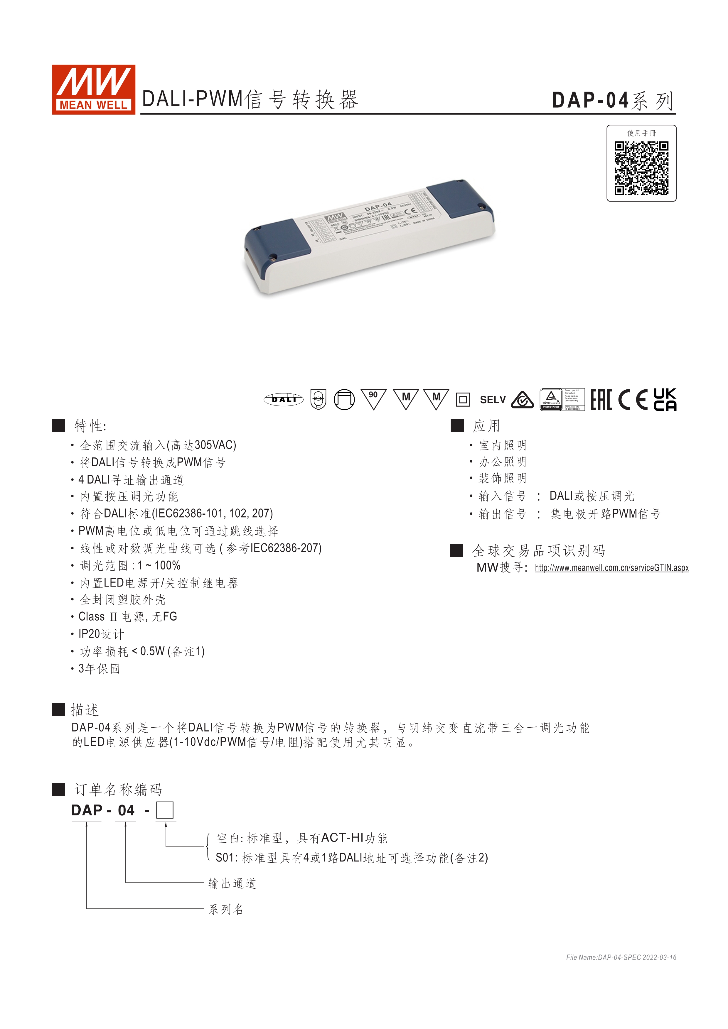 90~305VAC交流輸入 DALI訊號轉(zhuǎn)換為PWM訊號 4組DALI可尋址輸出通道 符合DALI標(biāo)準(zhǔn)(IEC62386-101, 102, 207) 適合與明緯具3合1調(diào)光功能之AC/DC LED電源供應(yīng)器搭配使用