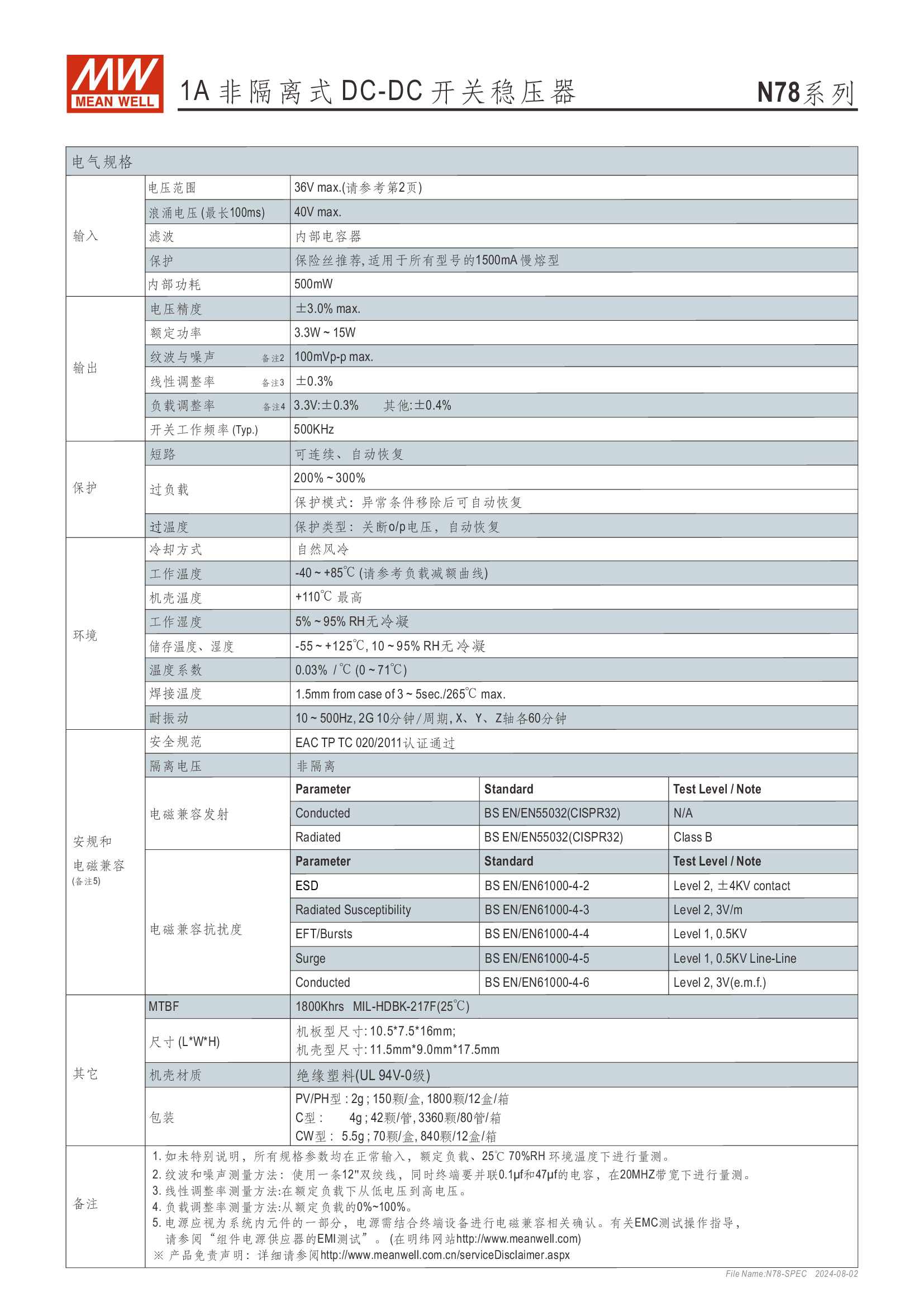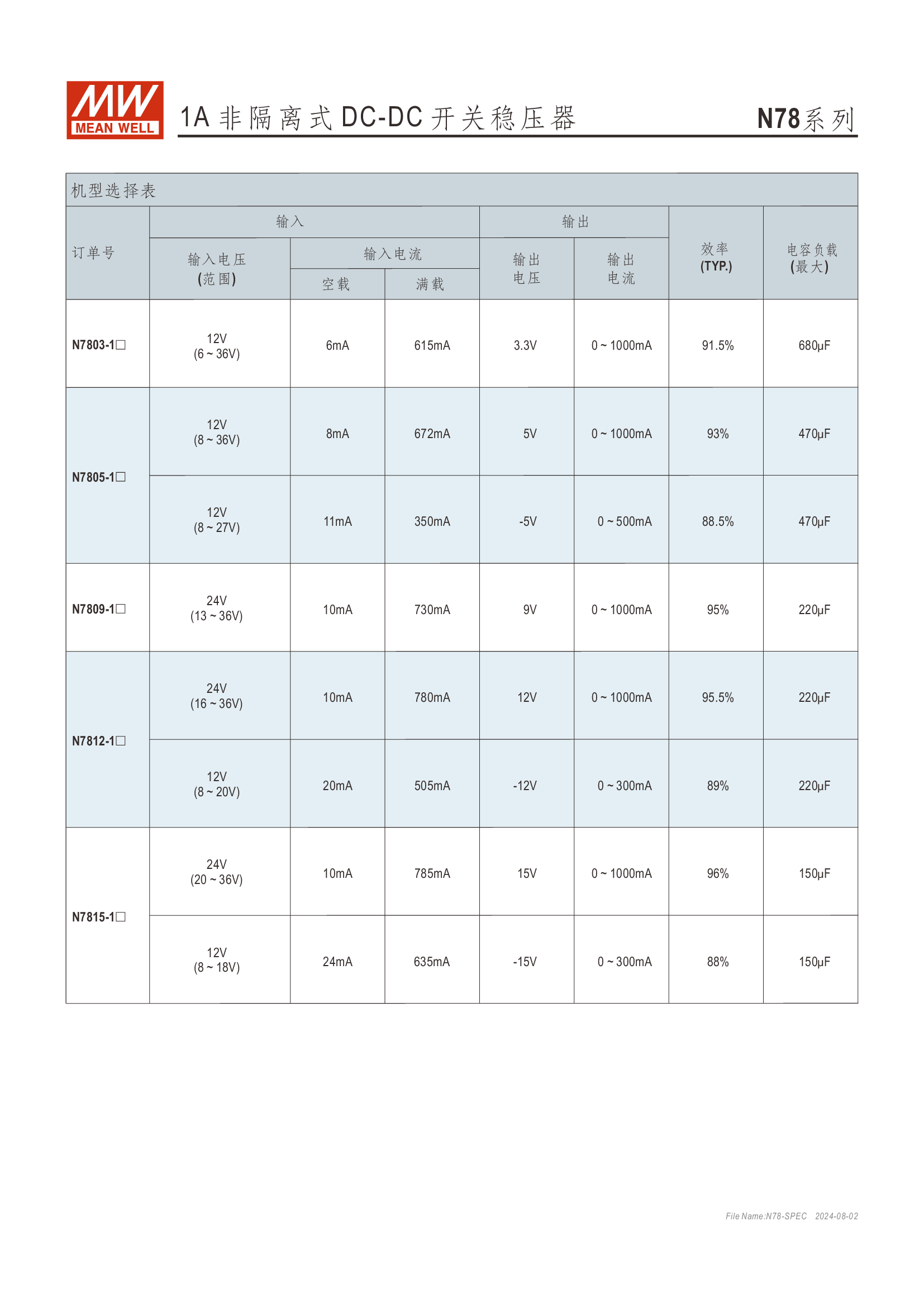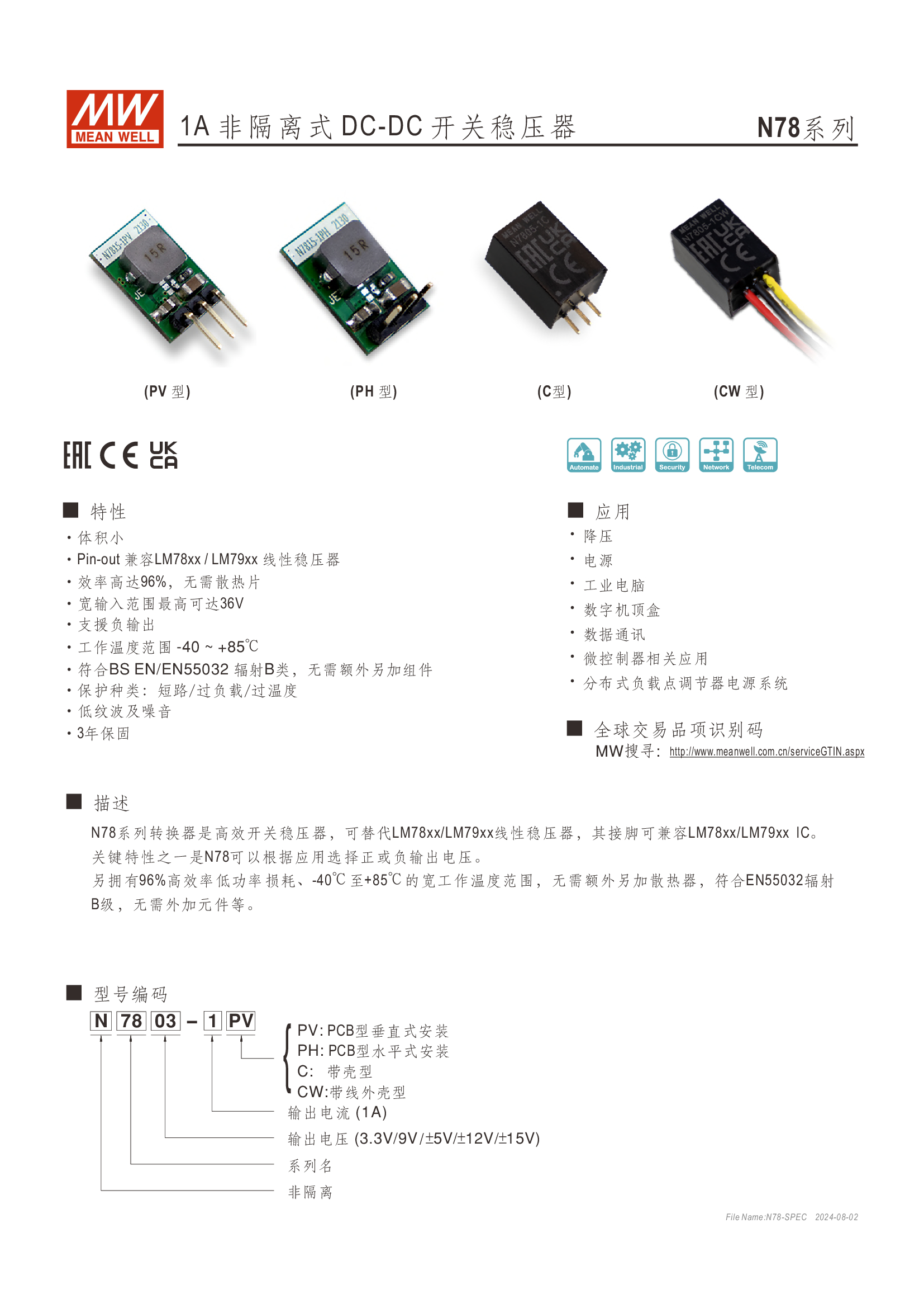 Pin-out 兼容 LM78xx/LM79xx 線性穩(wěn)壓器 效率高達(dá) 96%、無(wú)須散熱片 寬輸入范圍最高可達(dá) 36V 支援負(fù)輸出 工作溫度范圍:-40 ~ +85oC 符合 BS EN/EN55032 輻射 B 類(lèi)、無(wú)需另加組件 保護(hù)種類(lèi):短路/過(guò)負(fù)載/過(guò)溫度 3 年保固