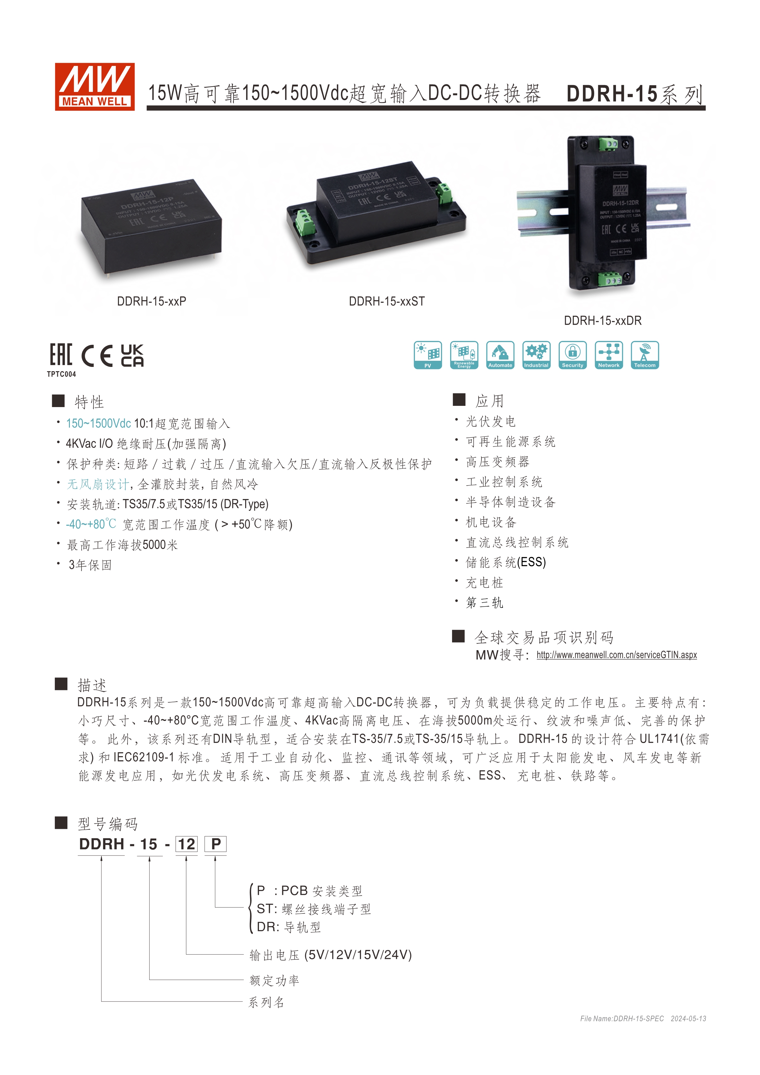 多種安裝方式可供選擇(基板型、端子式和導(dǎo)軌式) 150~1500Vdc 10:1 超寬輸入范圍 內(nèi)部灌膠,提供防塵和防潮保護(hù) 超寬溫度范圍:-40℃~+80℃ 保護(hù)功能:短路保護(hù)、超載保護(hù)、過電壓保護(hù)、輸入電壓過低及極性反接保護(hù) 3年保固