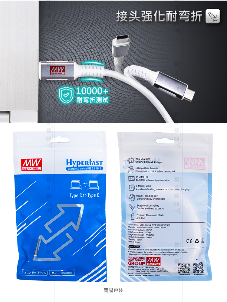 USB傳輸線 明緯聯(lián)源精密USB 3.2 GEN2 Type C 240W充電/傳輸線